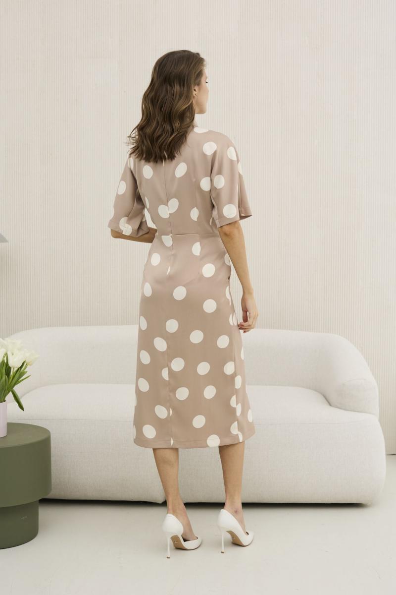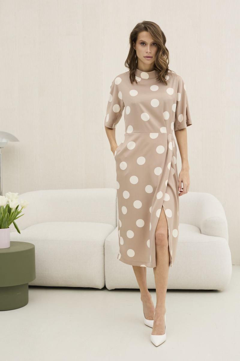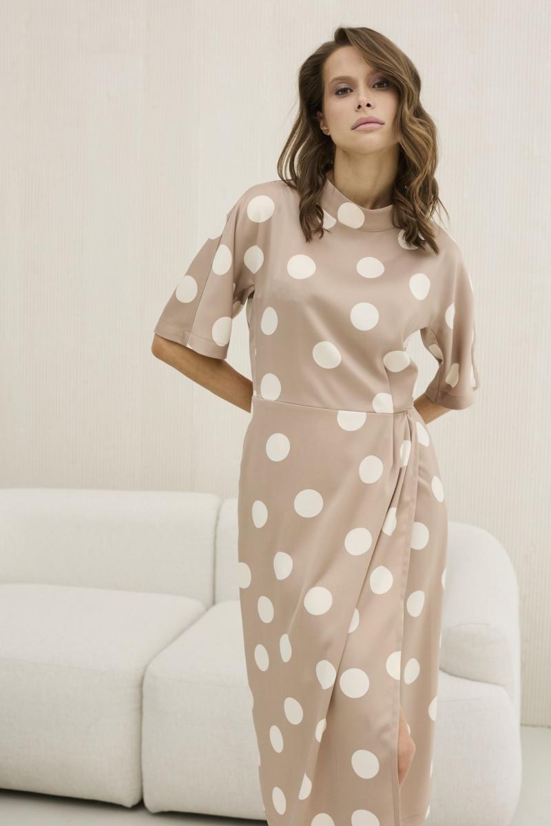 Платье женское, приталенного силуэта, выполнено из искусственного шелка с принтом . Отрезное по линии талии , платье на запах в нижней части . Платье с цельновыкроенным рукавом и отрезным бочком до талии -идеально сидит на всех типах плечевого пояса . Воротник в виде изящной стойки , которая застегивается на навесные петли и пуговицы сзади . По среднему шву спинки также застежка - потайная молния .В боковых швах расположены функциональные карманы . Данная модель платья - идеальное дополнение к гардеробу современной девушки .