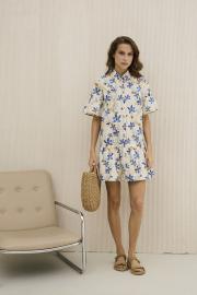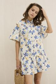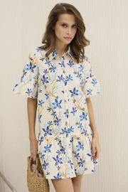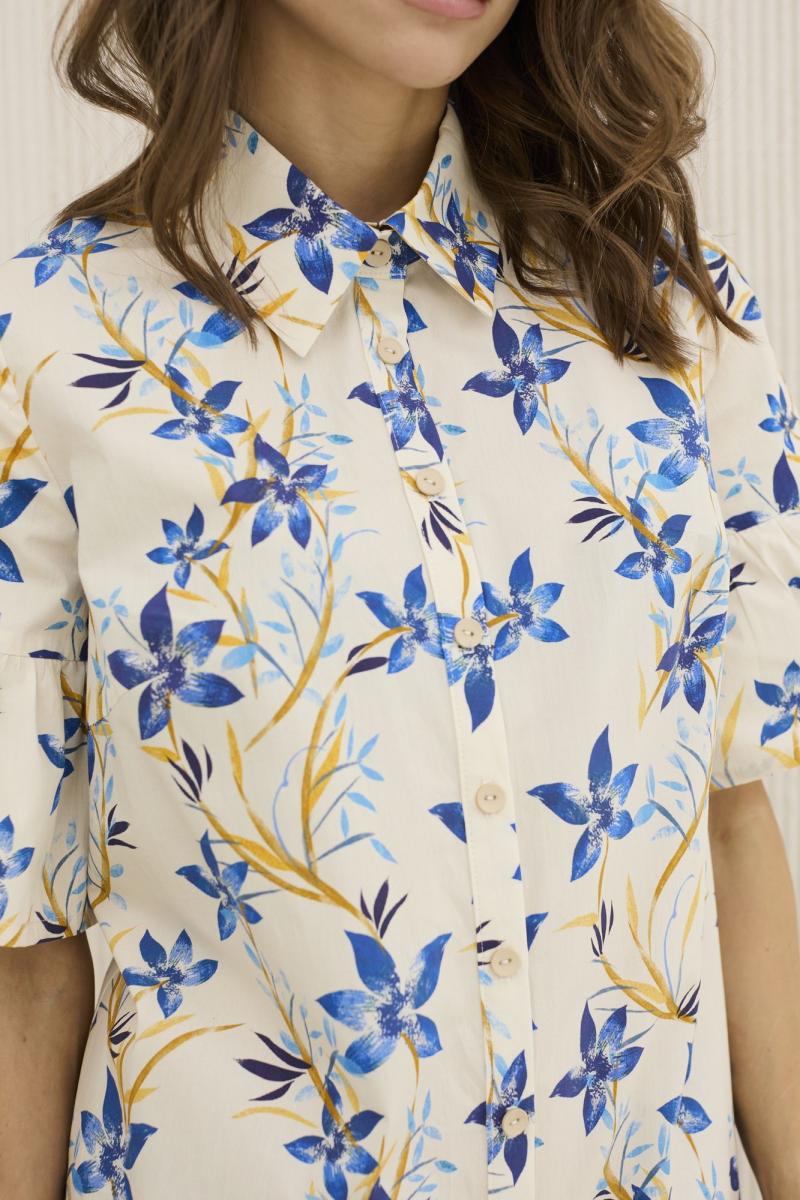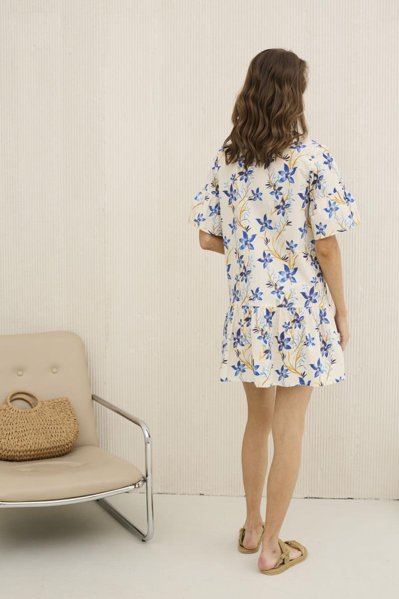 Платье женское , А-образного силуэта . Выполнено из 100 % хлопка с принтом . Платье распашное с центральной застежкой в виде планки на петли и пуговицы . Горловина оформлена рубашечным воротником . Рукав втачной одношовный с оборкой . По линии бедер порез , куда притачена оборка