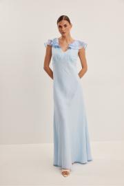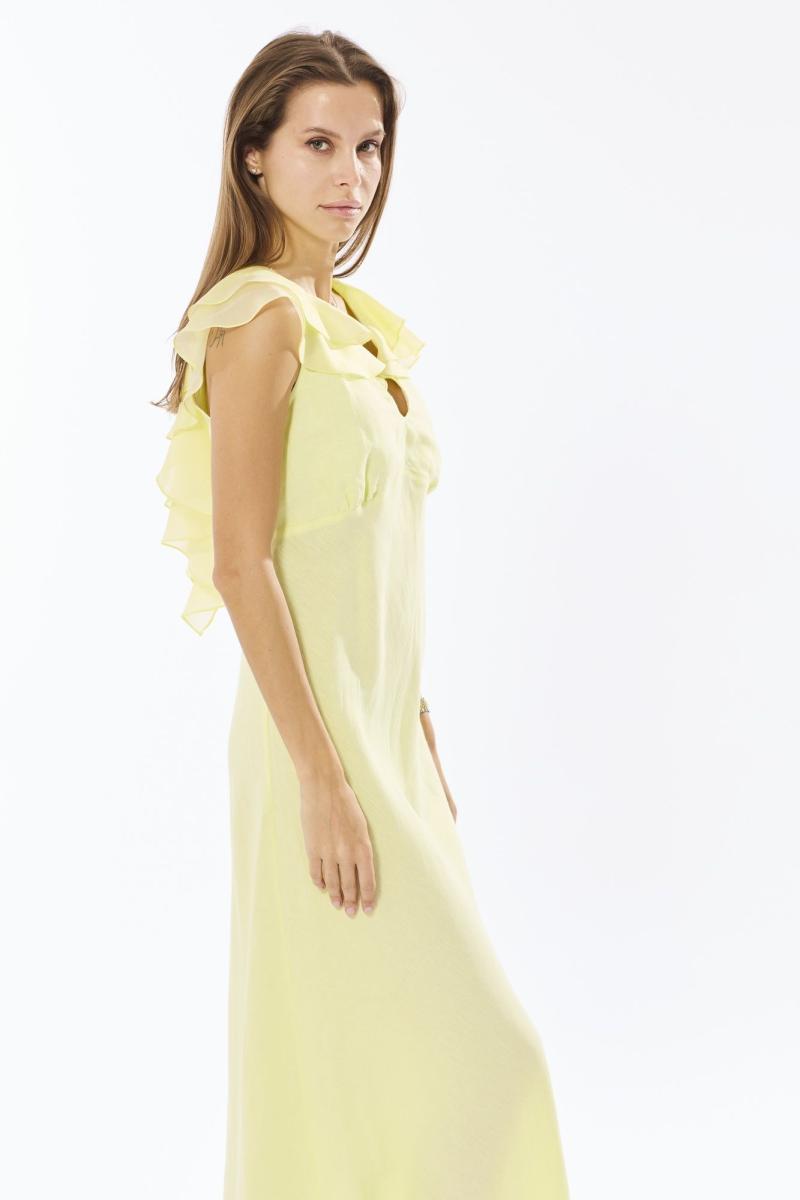 Платье женское полуприлегающего силуэта ,отрезное под грудью . Нижняя часть платья раскроена по косой , что очень стройнит фигуру. Акцентом данного платья являются воланы из вуали , которые переходят на спику и декорируют ее.