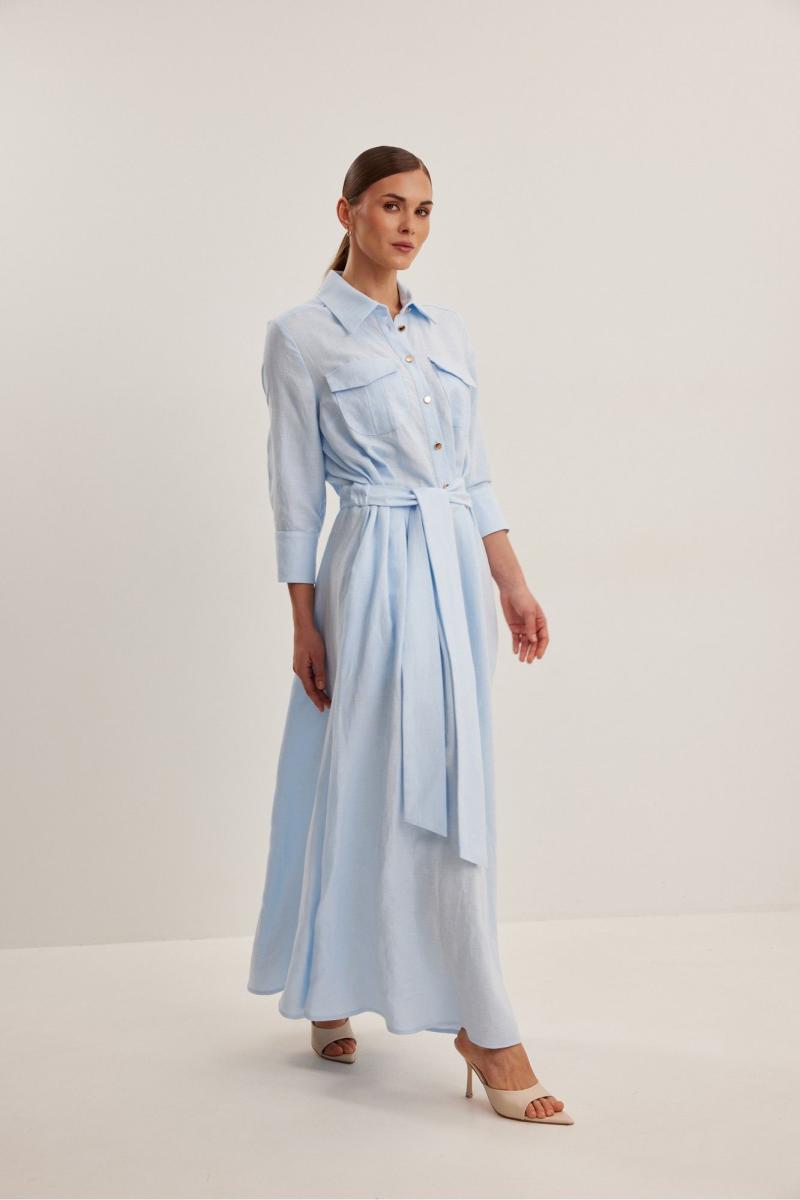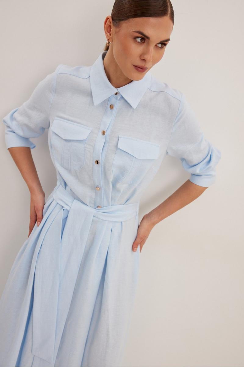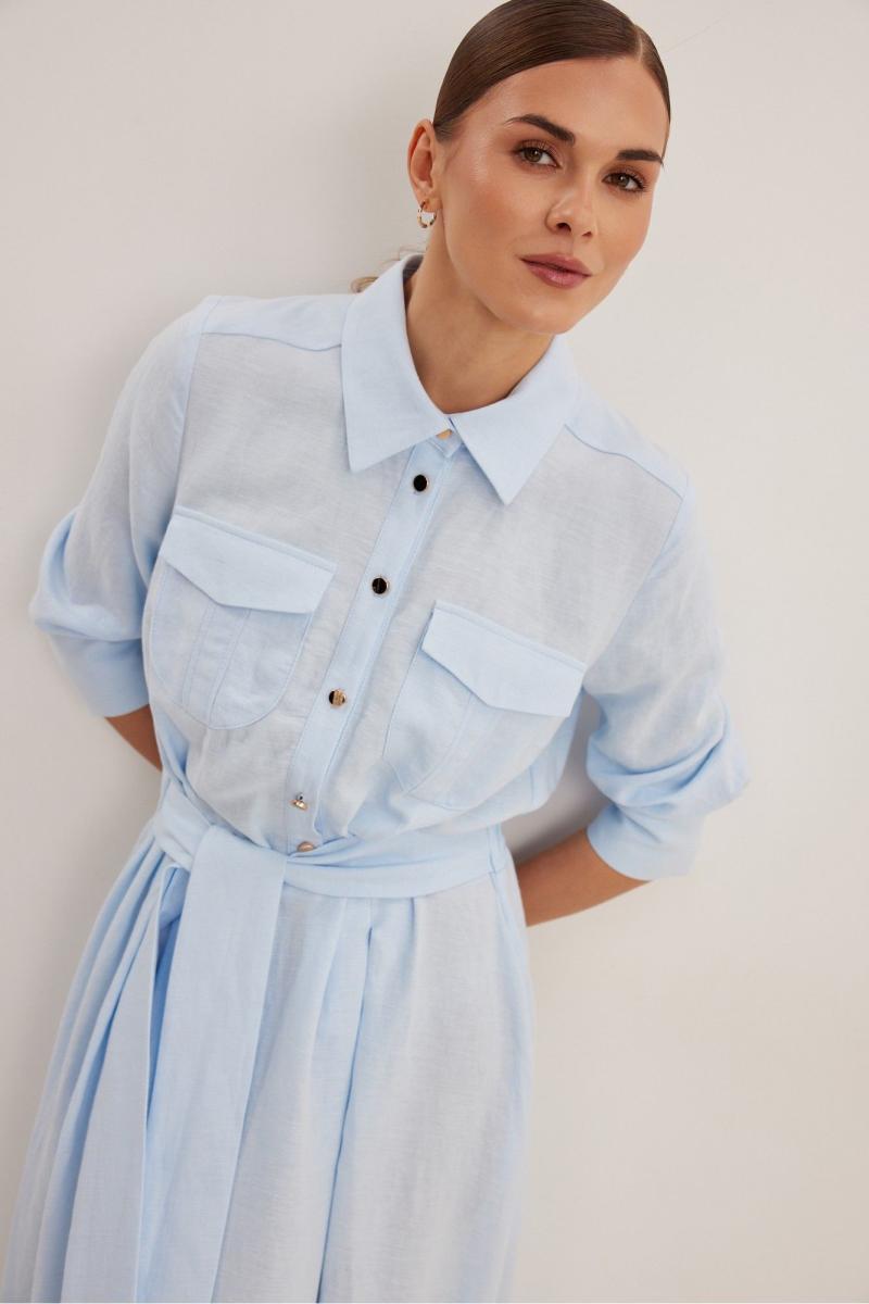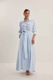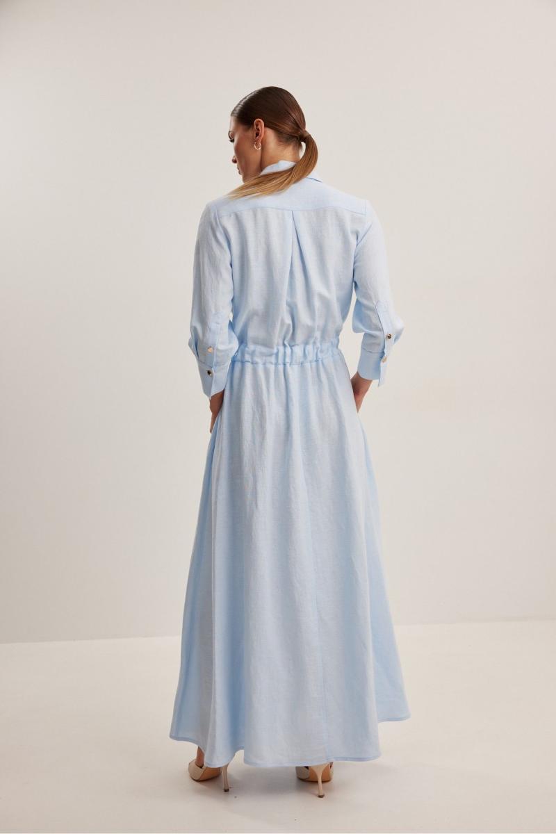 Платье женское , приталенного силуэта .Выполнено из смесового льна.Рукав втачной одношовный с манжетой и шлицей .Застежка центральная в виде планки на петли и пуговицы .Сзади по талии кулиса с резинкой,в боковые швы пришит пояс . Платье расширено к низу , отрезное по линии талии .В боковых швах функциональные карманы .