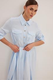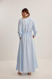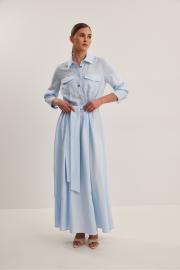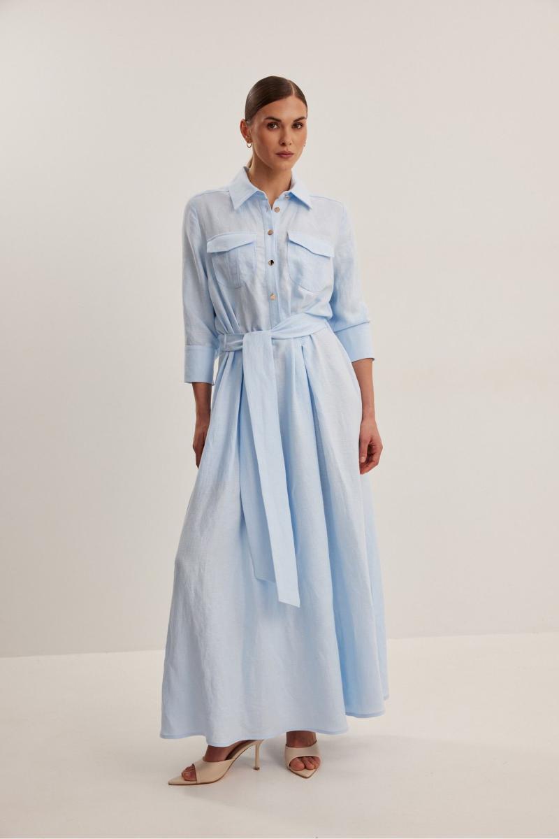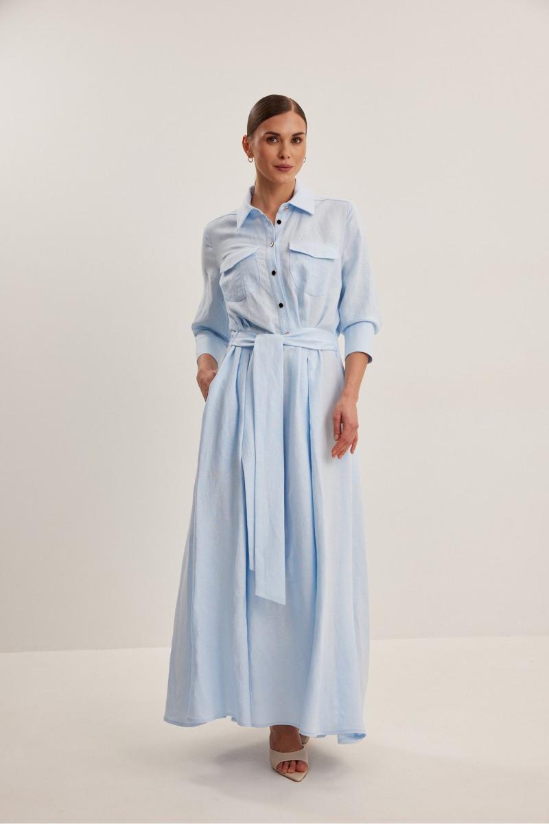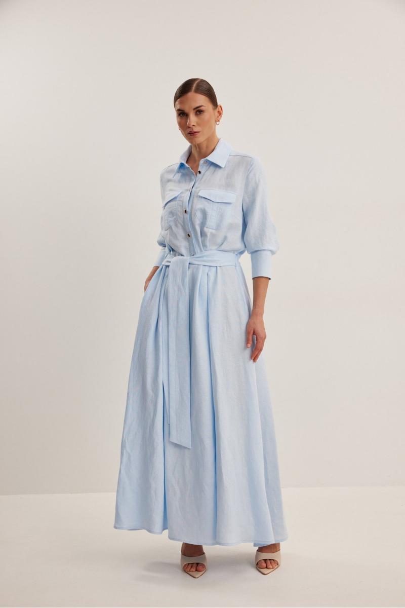 Платье женское , приталенного силуэта .Выполнено из смесового льна.Рукав втачной одношовный с манжетой и шлицей .Застежка центральная в виде планки на петли и пуговицы .Сзади по талии кулиса с резинкой,в боковые швы пришит пояс . Платье расширено к низу , отрезное по линии талии .В боковых швах функциональные карманы .