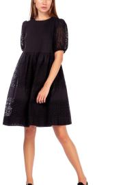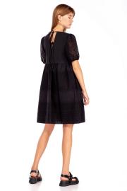 Платье женское , свободного силуэта . Выполнено из хлопкового однотона и ришелье. Вырез горловины округлой формы . Рукав втачной со сборкой и эластичной лентой внизу . Платье отрезное выше линии талии . Нижняя часть платья и рукав выполнены из хлопкового ришелье . В верхней части спинки Y-образный вырез с завязками .