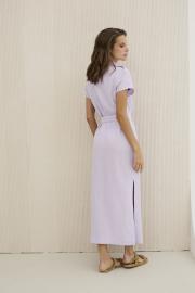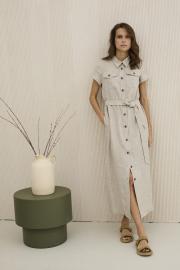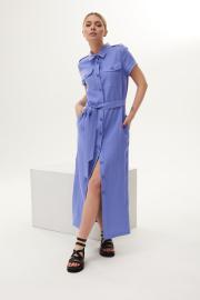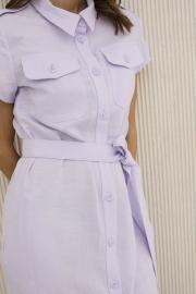 Платье женское, прямого силуэта. Выполнено из льняной ткани, в состав которой входит вискоза , что придает мягкость на ощупь . Платье распашное с центральной застежкой в виде планки на петли и пуговицы . Горловина оформлена воротником рубашечного типа. Рукав втачной короткий с плавной окантованной линией низа. По переду платья нагрудные карманы с клапанами . По боковым швам функциональные карманы и разрезы с закрытыми срезами. В комплекте съемный пояс из основной ткани.