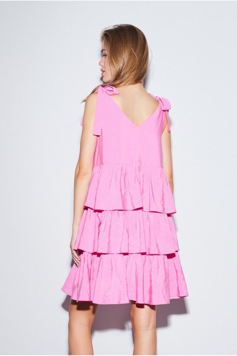 Платье из лёгкой вискозной ткани, А-силуэта, отрезноё выше линии талии, без рукавов, с завязками на плечах, горловина V-образной формы. Платье длиной выше линии колена, с тремя воланами и сборкой по шву притачивания. Лиф переда с нагрудными вытачками, спинки без особенностей. Платье на вискозной подкладке.