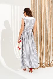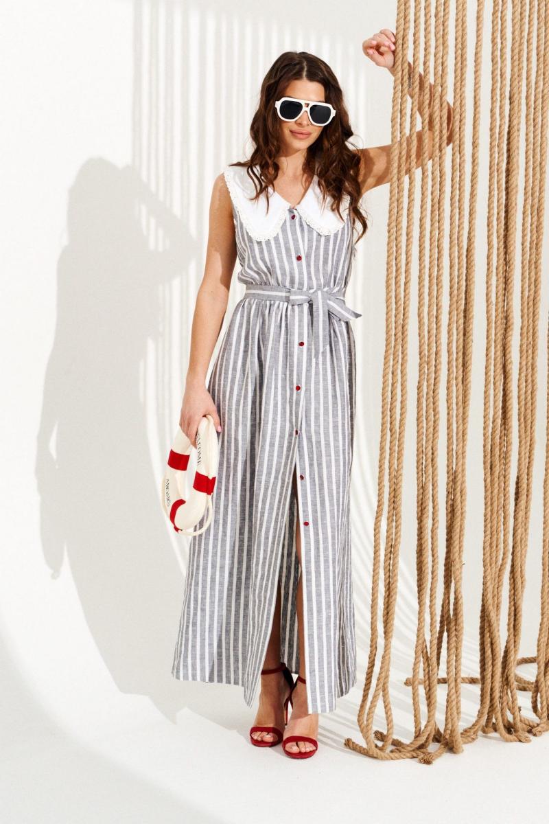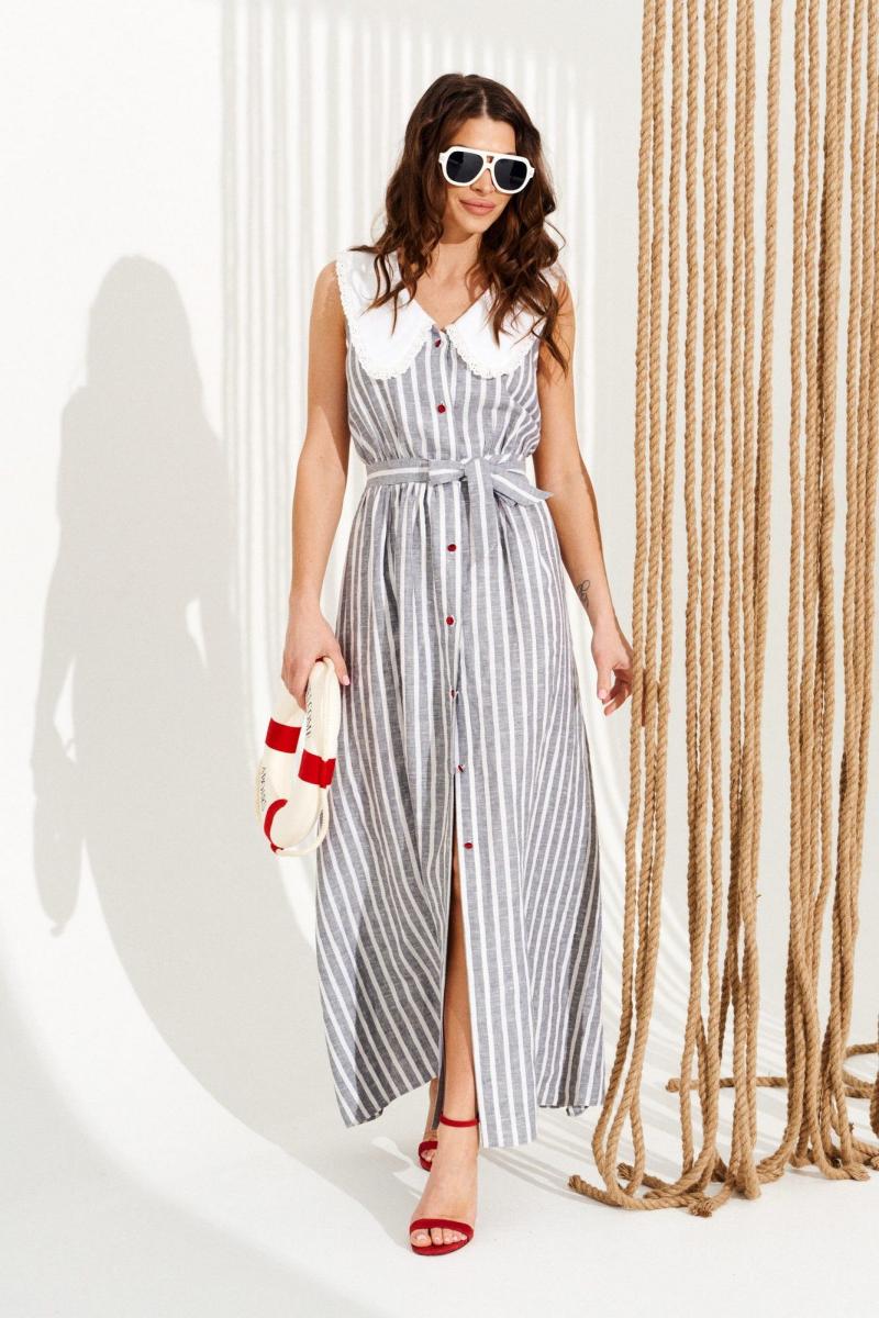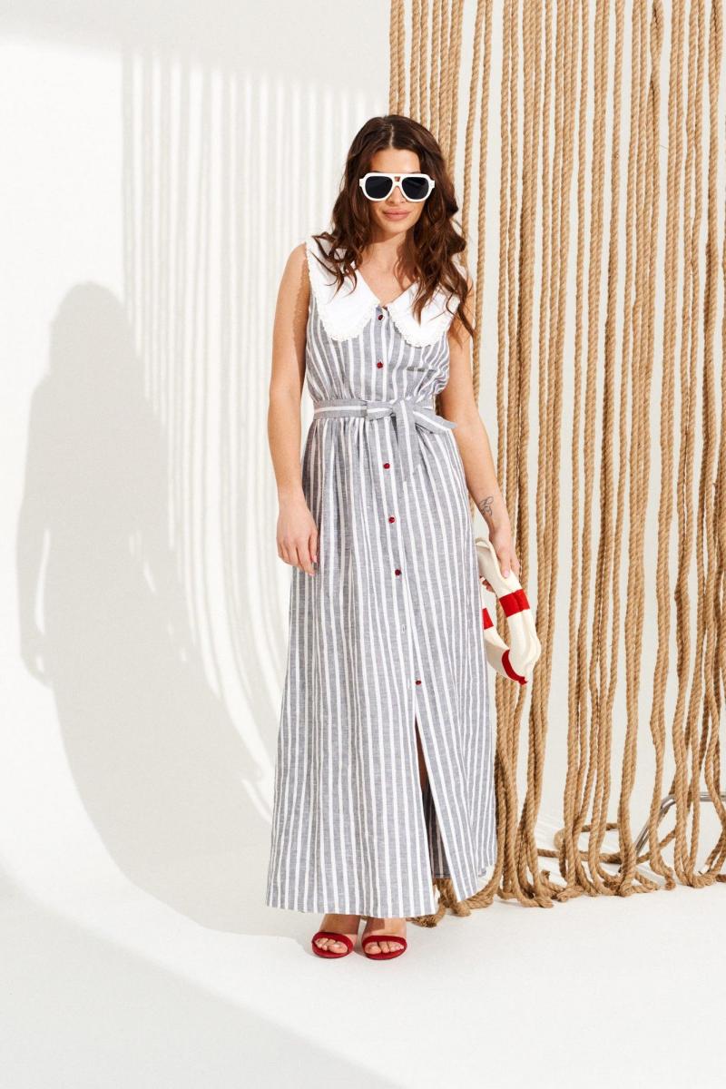 Платье приталенного силуэта, расклешенное книзу, с центральной застежкой на петли и пуговицы, отложным фигурным воротником. Воротник оформлен сборкой из кружева. Перед и спинка с притачным поясом. Для регулировки приталенности в боковые швы пояса вставлены завязки. Верхняя деталь спинки с талиевыми вытачками. Длина изделия на модели вдоль середины спинки — 140,5 см (допустимое отклонение +/- 1 см)
