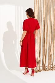Платье умеренного объема, приталенного силуэта, расклешенное книзу, отрезное по линии талии, с запахом на завязках и V-образным вырезом горловины. Верхние детали переда с талиевыми вытачками. Нижняя часть переда и спинки со сборкой по верхнему срезу. Приталенность регулируется завязками. Рукав втачной, короткий, со сборкой по верхнему и нижнему срезу. Нижний срез рукава на резинке. Длина изделия на модели вдоль середины спинки — 130 см (допустимое отклонение +/- 1 см)