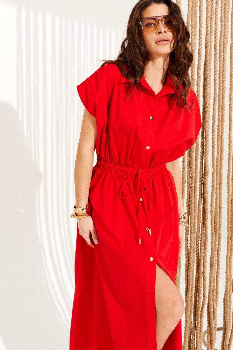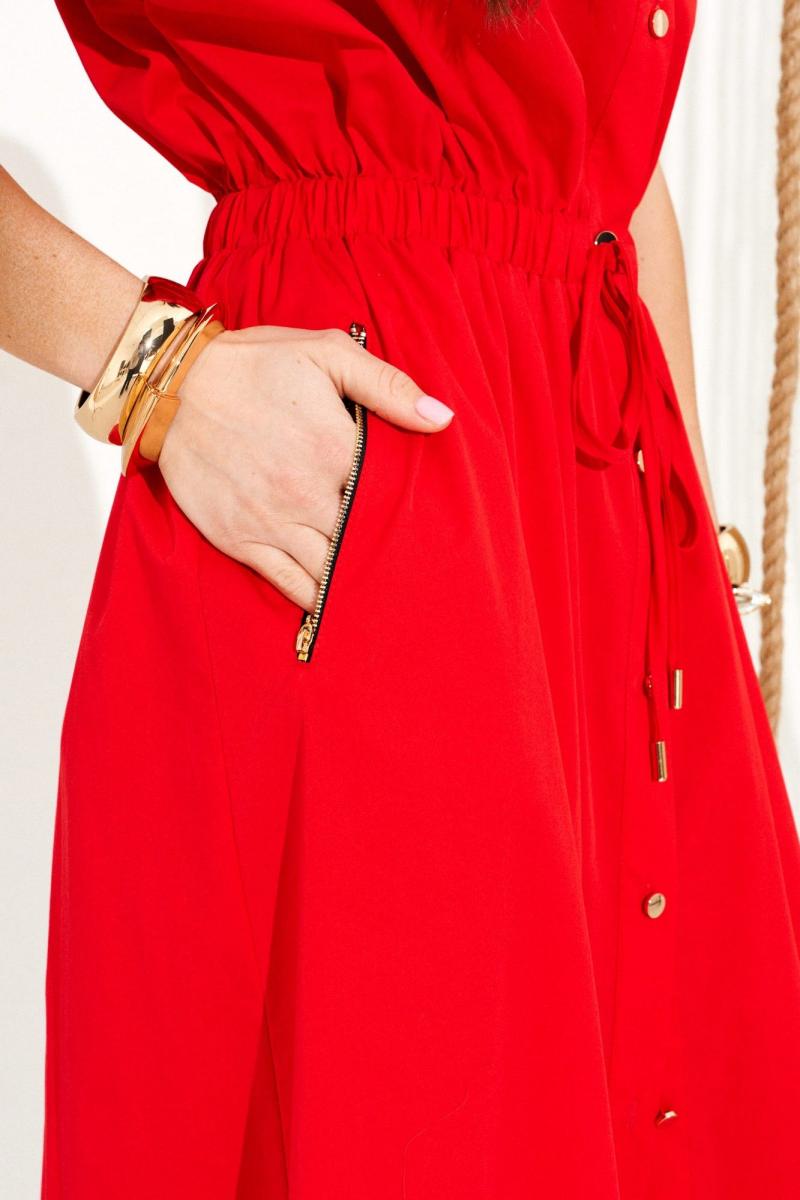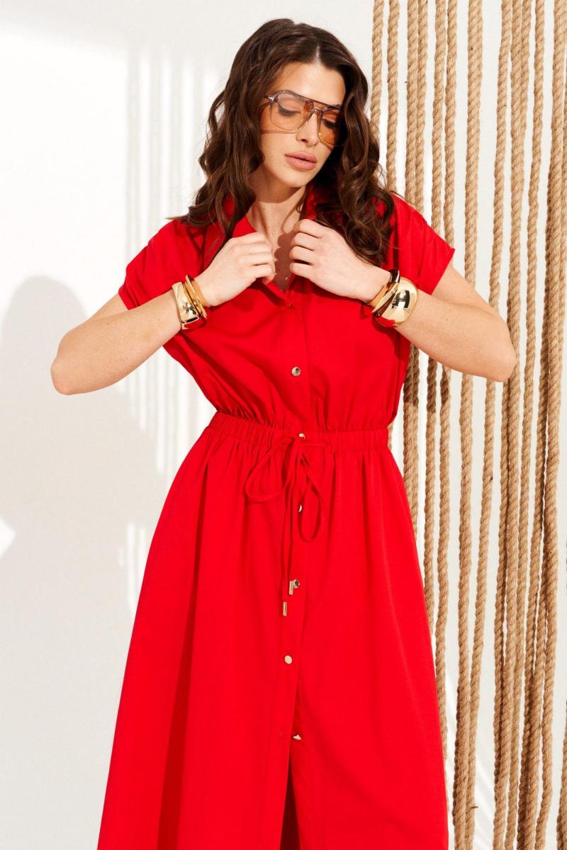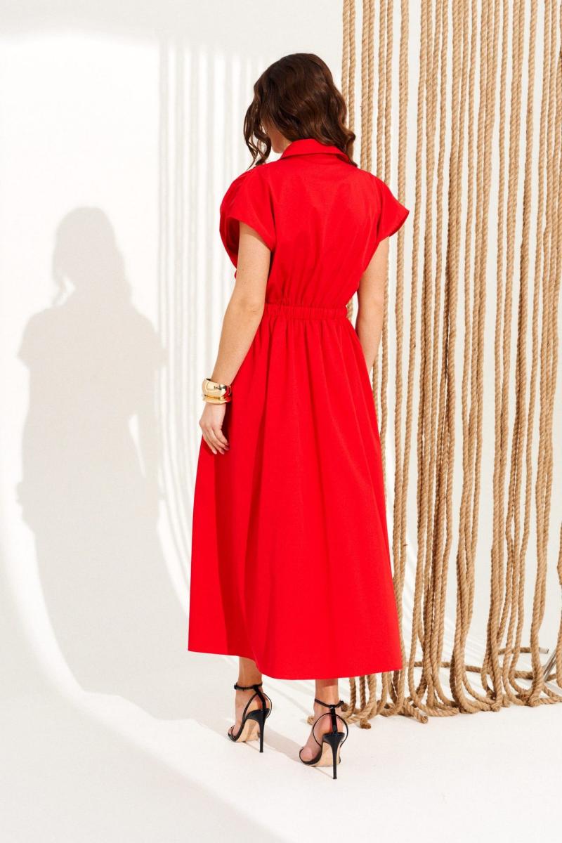 Платье умеренного объема, приталенного силуэта, с центральной застежкой на петли и пуговицы и спущенной линией плеча. Воротник стояче-отложной с отрезной стойкой. Пояс отрезной, на резинке, со шнуром-завязкой и наконечниками. Верхние детали переда со сборкой по плечевому шву. Нижние детали переда с боковыми прорезными карманами с застежкой на тесьму-молнию. Длина изделия на модели вдоль середины спинки — 129,5 см (допустимое отклонение +/- 1 см)