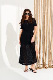 Платье из трикотажного полотна, умеренного объема, полуприлегающего силуэта, с круглым вырезом горловины. Вырез горловины обработан притачной обтачкой. Перед и спинка цельные. Левый боковой шов заканчивается разрезом. Рукав втачной, короткий. В комплекте декоративный пояс с бусинами. Нижнее платье умеренного объема, полуприлегающего силуэта, на регулируемых бретелях, с V-образным вырезом горловины. Перед с нагрудными вытачками. Длина изделия на модели вдоль середины спинки — 132 см (допустимое отклонение +/- 1 см)