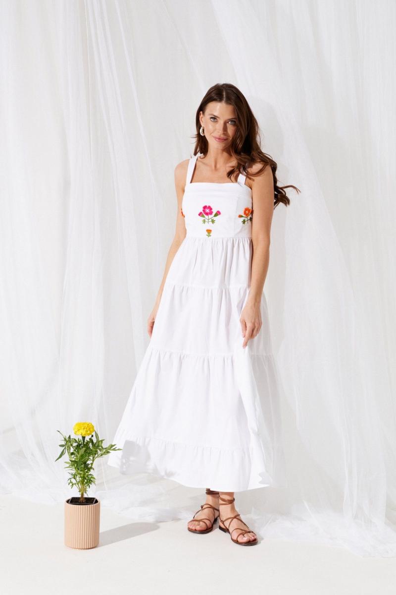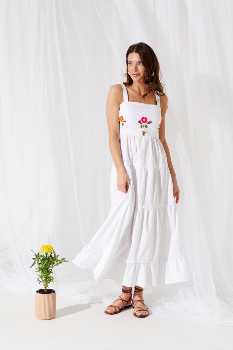 Сарафан женский, полуприлегающего силуэта, с фигурным вырезом горловины, застежкой на потайную молнию в среднем шве спинки, на бретелях. Лиф переда отрезной, с горизонтальным и вертикальными рельефными швами. Лиф украшен вышивкой "цветы". Нижняя часть платья четырехъярусная. Спинка отрезная, со средним швом и талиевыми вытачками.