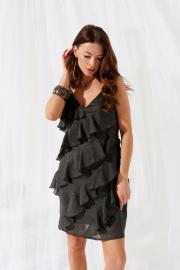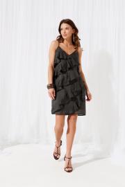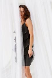 Платье , полуприлегающего силуэта, длиной выше колена, с V-образным вырезом горловины, застежкой на потайную молнию в левом боковом шве, на регулируемых бретелях. Перед с нагрудными вытачками. По переду и спинке изделие оформлено диагональными подрезами с воланами.