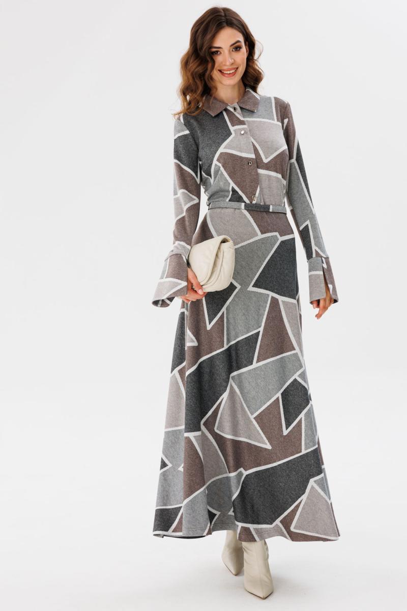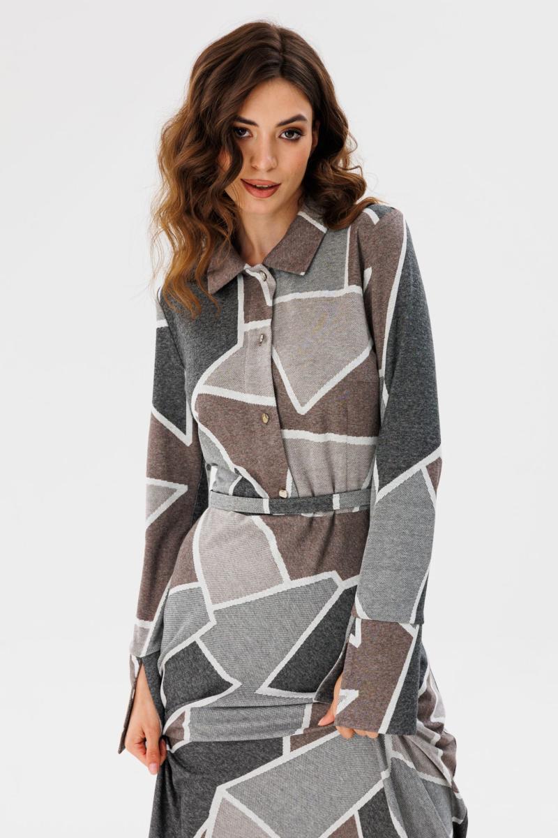 Платье выполнено из трикотажного полотна с геометрическим принтом. Платье Х-образного силуэта, отрезное по линии талии, длиной миди. Застежка спереди на пуговицы на планке. Воротник стояче-отложной. Рукав втачной, одношовный. Низ рукава на широкой притачной манжете с разрезом. Юбка расширена к низу. В боковом шве застежка на потайную молнию. В комплект входит обтяжной ремень.