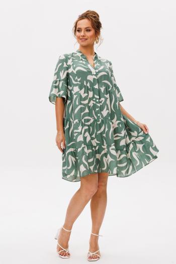 Платье выполнено из плательно-блузочной ткани. Платье А-образного силуэта, длиной миди. Горловина округлой формы. На спинке средний шов с застежкой на молнию с металлическими звеньями. Плечевой шов заужен. Пройма квадратной формы. Юбка расширена к низу. Юбка цельная со встречными складками по центру с обеих сторон. В боковых швах карманы.