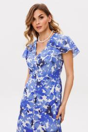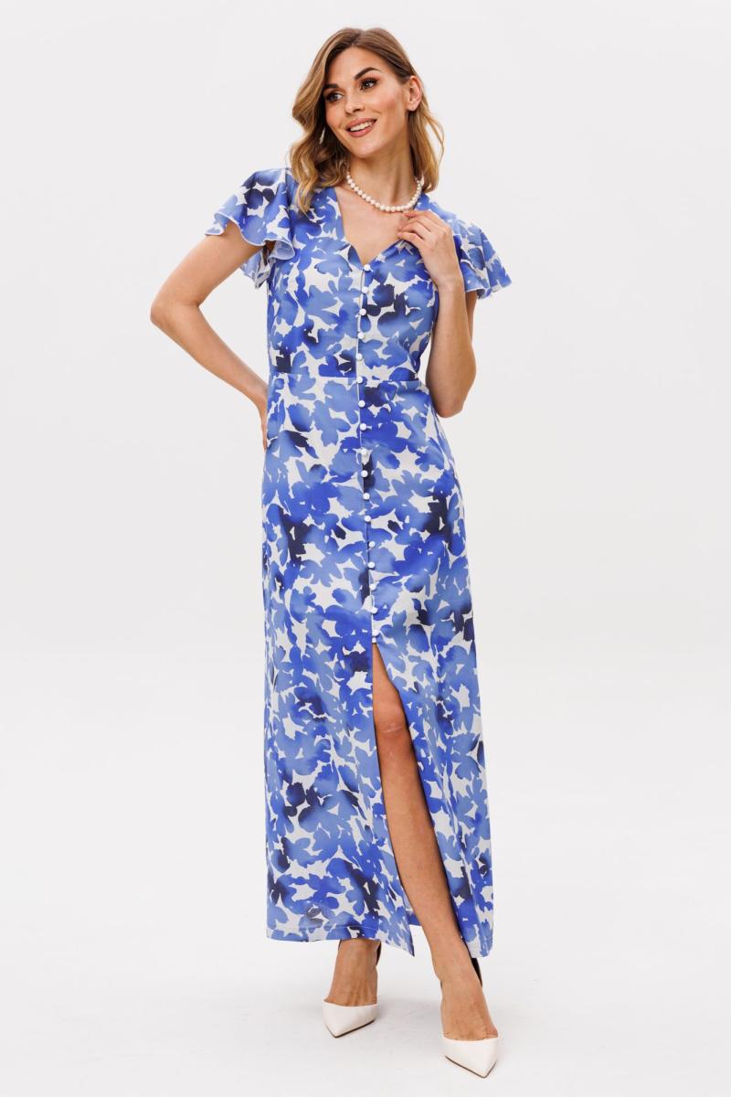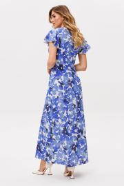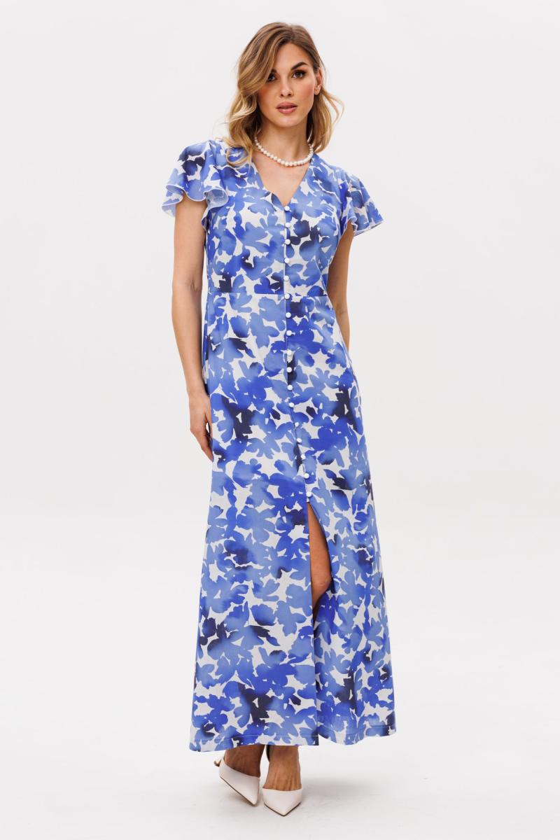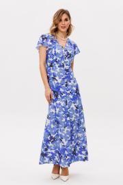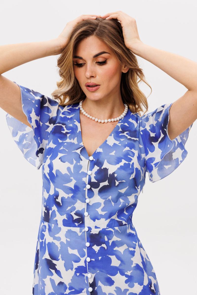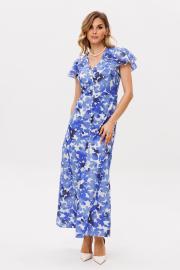 Платье выполнено из плательно-блузочной ткани с цветочным принтом. Платье Х-образного силуэта, длиной миди. Платье отрезное по линии талии. Спереди центральная застежка на пуговицы. Горловина переда V-образной формы. Плечевой шов заужен. Рукав втачной, одношовный, длиной выше линии локтя, расширенный к низу. Платье на отлетной по низу подкладке. Длина платья: р. 44-48 - 136 см, р. 50-54 - 137 см. Длина рукава: р. 44-48 - 25 см, р. 50-54 - 26 см.