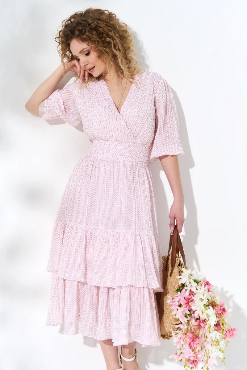 Платье выполнено в романтичном стиле. Изделие прилегающее по линии талии и выполнено из шифона с небольшой плиссировкой. Платье отрезное по линии талии, лиф «на запах», пояс изделия регулируется резинками по бокам. Рукав втачной, по низу рукава манжет из тонкой сетки Юбка по низу с двумя пришивными воланами на разном уровне. Платье на полной подкладке. Длина изделия 117 см. Длина рукава 42 см
