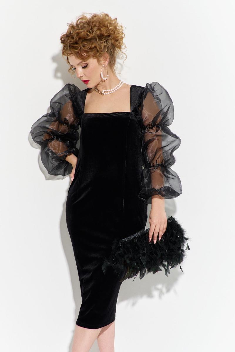 Вечернее платье выполнено из бархатной ткани в сочетании с органзой. Изделие прилегающего силуэта зауженное к низу. Вырез горловины низкий квадратный. Платье на широких фигурных лямках, рукав втачной длинный, с эластичной тесьмой. По спинке изделия расположены таллиевые выточки и средний шов застежка потайная молния
