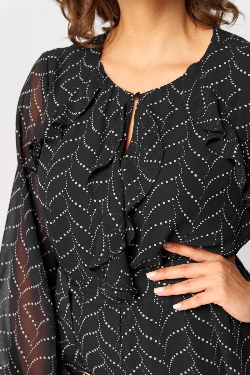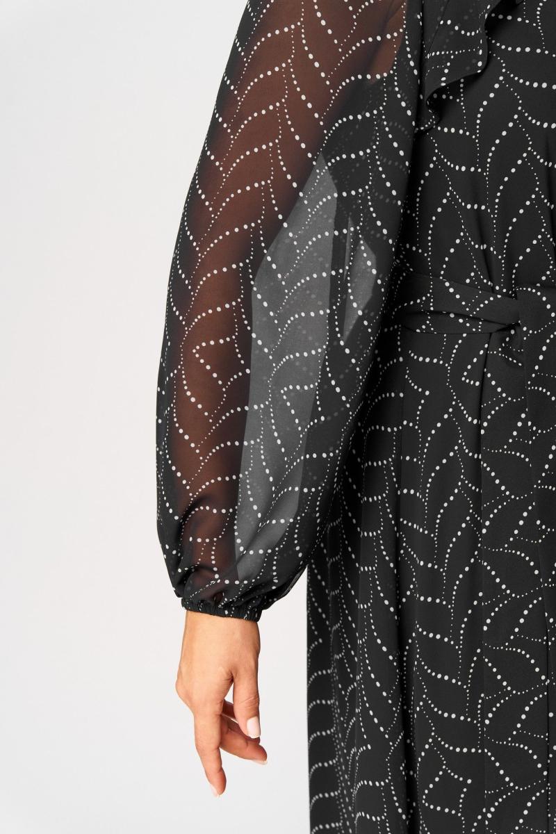 Платье женское нарядно-повседневное на трикотажной подклаке полуприлегающего силуэта расширенное к низу. Выполнено из шифона с принтом. Вырез горловины круглый на обтаке по центру на застежке на навесную петлю и пуговицу. Рукав втачной по низу собран на резинку. Декором служат рюши по лифу из основной ткани и съемный пояс. Платье можно носить с поясом и без него.
