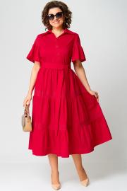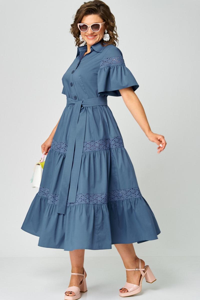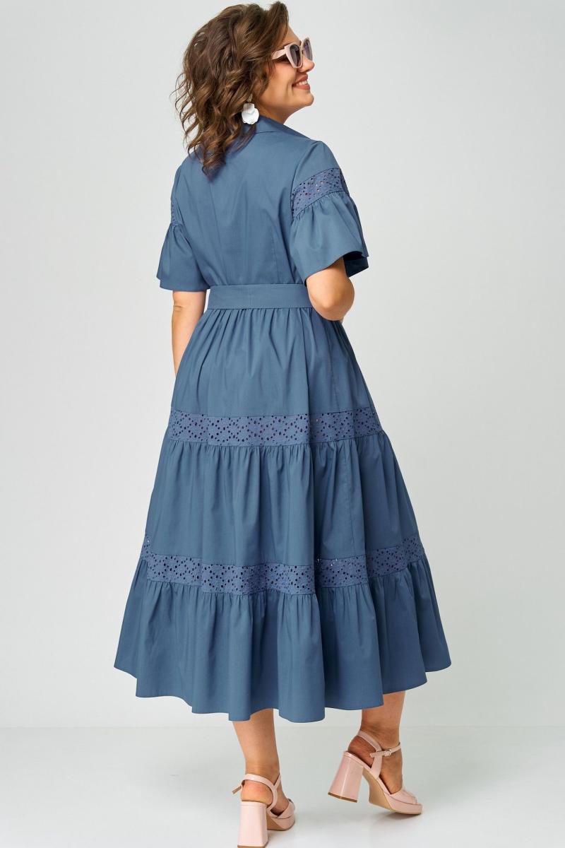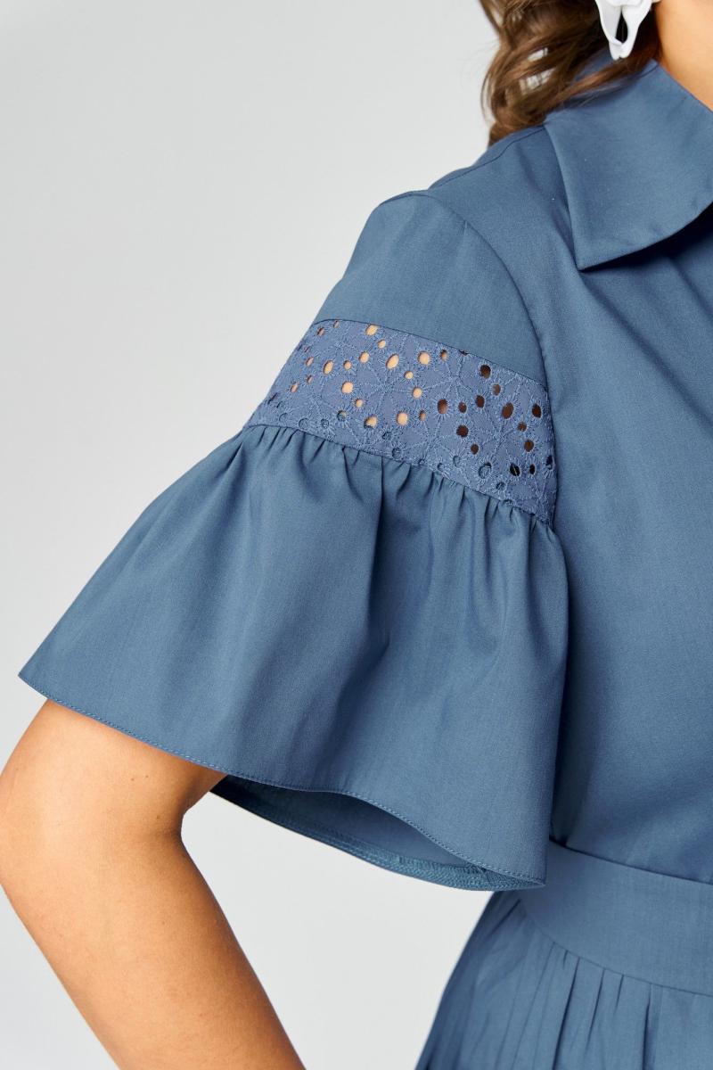 Платье женское нарядно-повседневное полуприлегающего силуэта до талии расширенное к низу за счет воланов. выполнено из хлопка в сочетании с отделкой из шитья в цвет основной ткани. Вырез горловины воротик на стойке рубашечного типа, рукав втачной с притачным воланом со соркой и вставкой из шитья. По переду платья ассиметричная вставка с иммитацией застежки. Декором платья служит съемнй пояс из основной ткани и вставки из отделочной ткани. Подходит на рост 164-170