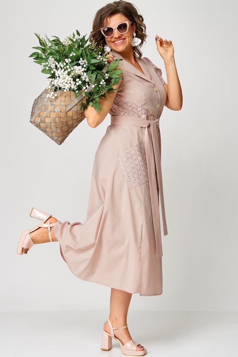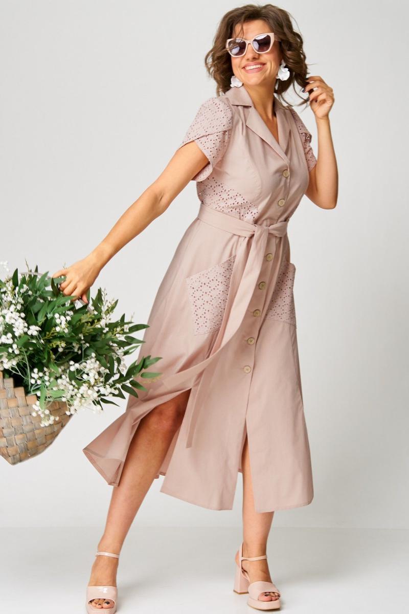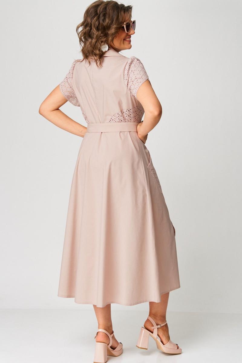 Платье женское нарядно-повседневное полуприлегающего силуэта слегка расширенное к низу, выполнено из хлопка в сочетании с отделочным кружевом(шитье). Платье отрезное по талии с застежкой на обметанные петли и отделочные пуговицы. Вырез горловины отложной воротник и подборт, рукав "фентези". По переду платья накладные карманы и разрезы. Декором платья служат вставки по спинке и полочке из отделочной ткани и пояс из основной ткани. Подходит на рост 164-170