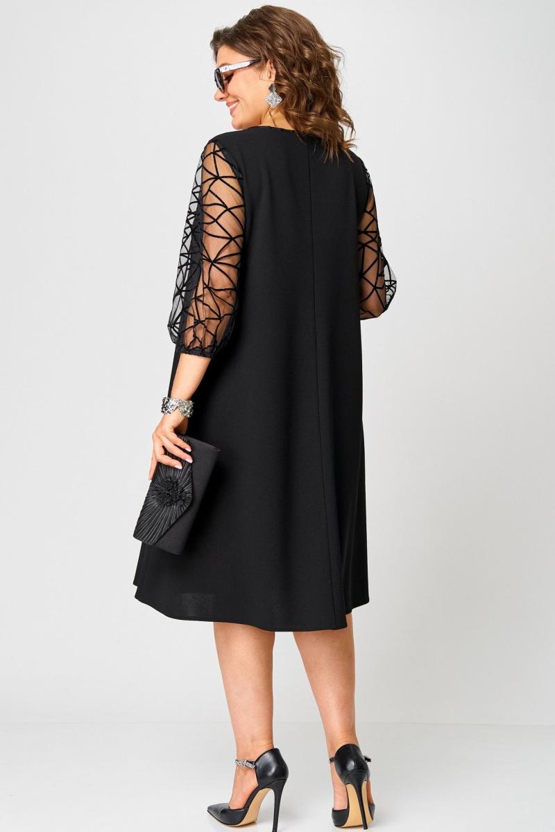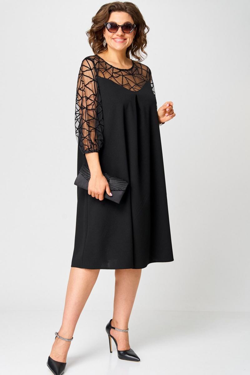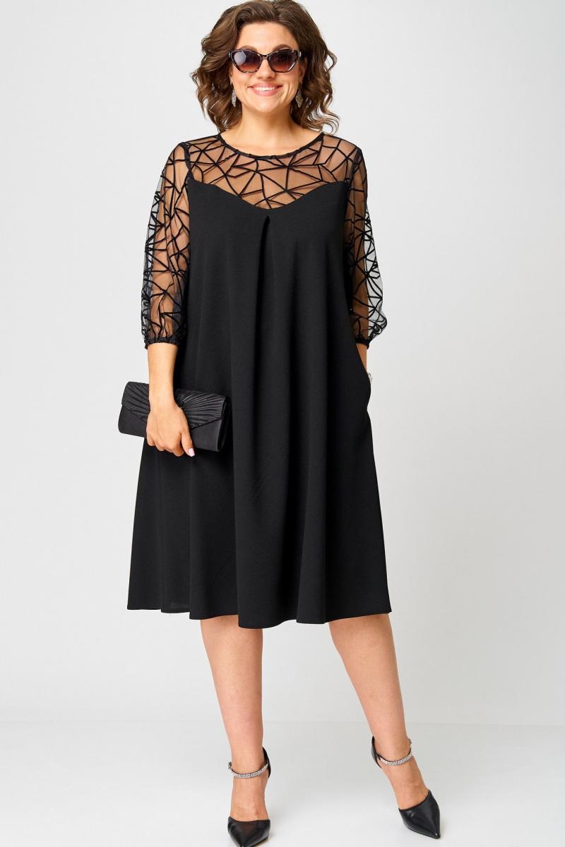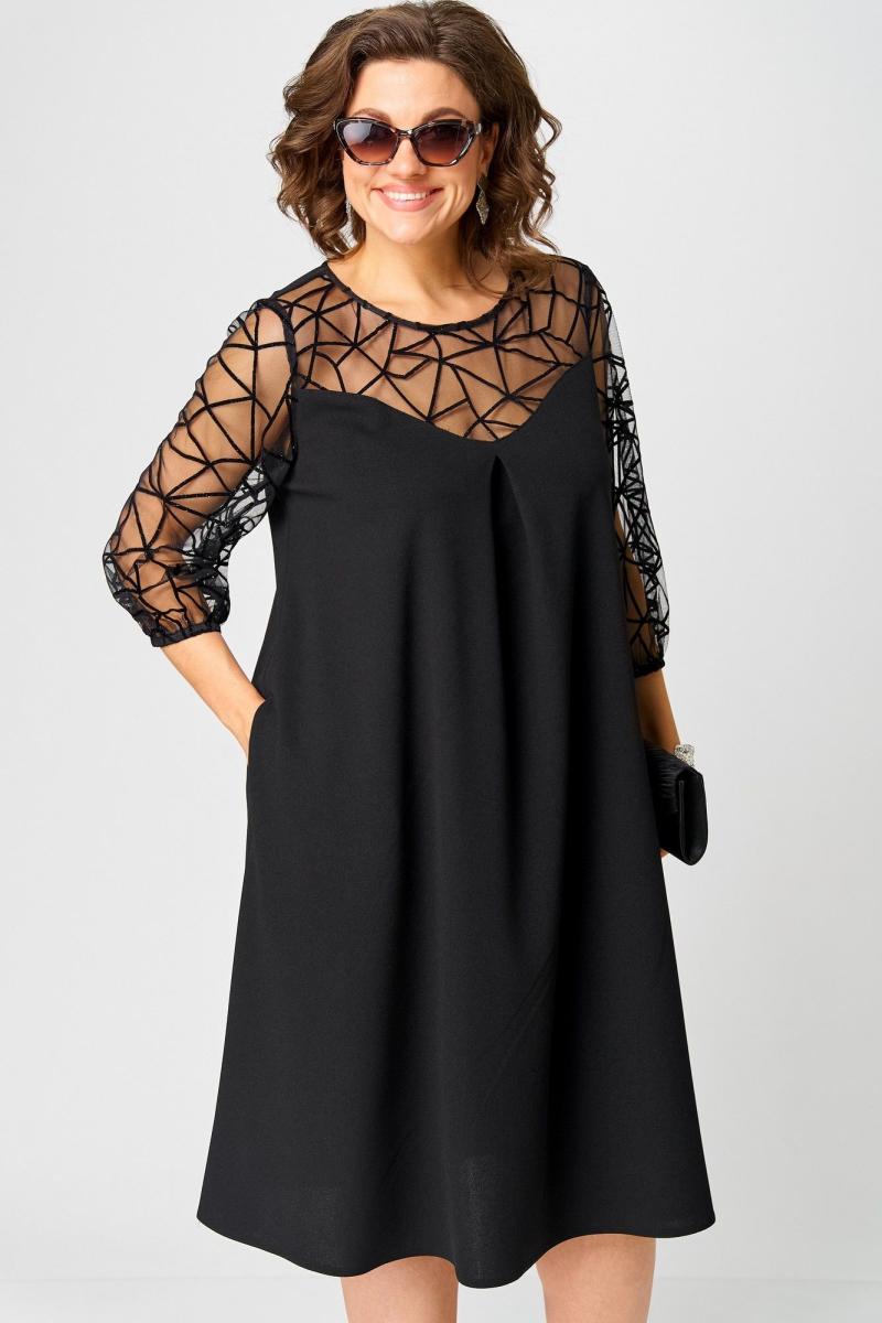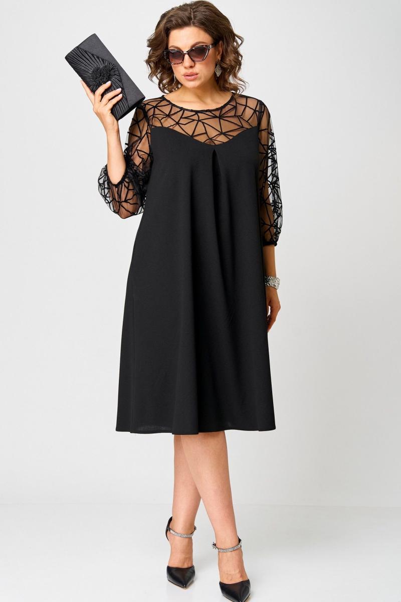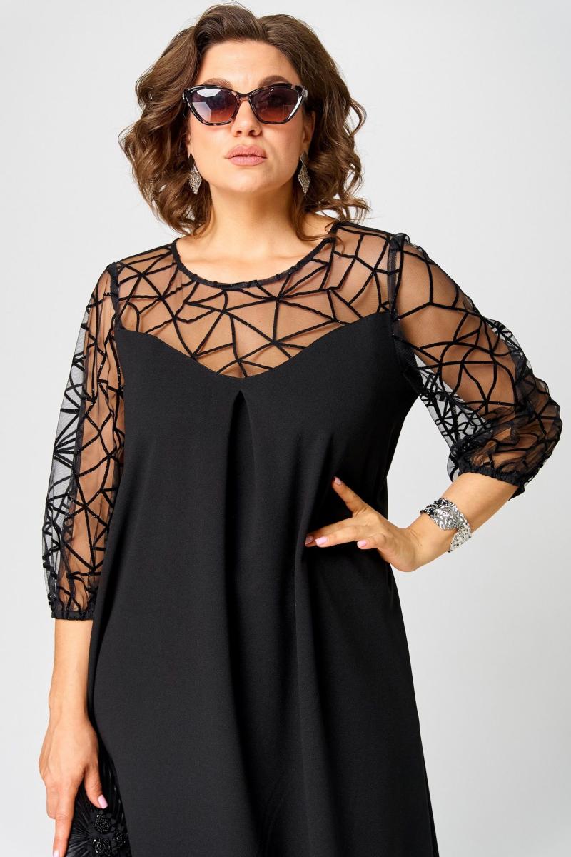 Платье женское нарядное А-силуэта выполнено из плательного крепа в сочетании с отделкой. Вырез горловины круглый обработан косой бейкой. Рукав втачной 7/8по низу на притпной резинке. В боковых швах обработаны карманы. По переду платья фигурная кокетка из отделочной ткани. По центру платья под кокеткой встречная складка. Декором служит дизайн отделочной ткани.