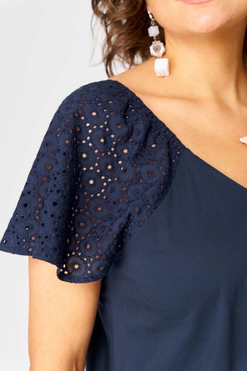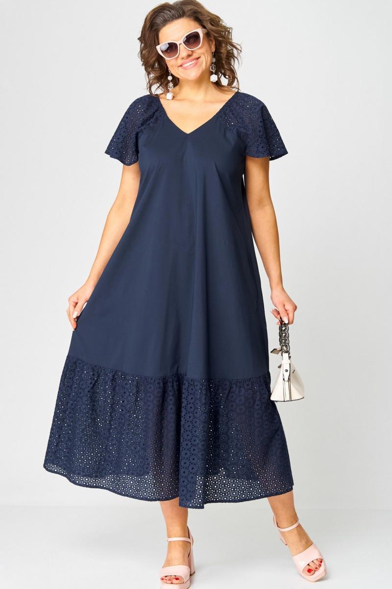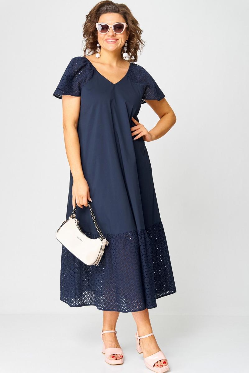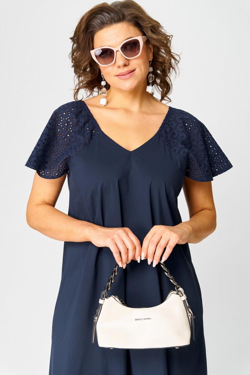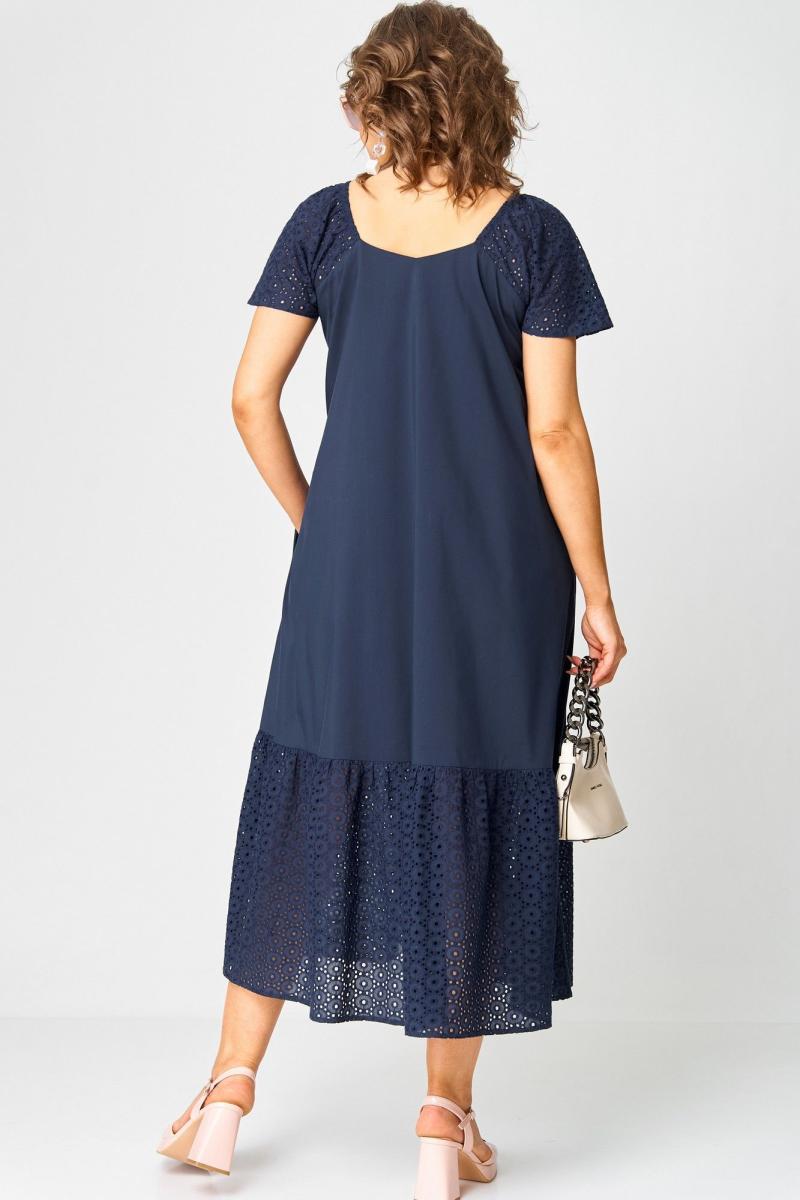 Платье женское нарядно-повседневное выполнено из однотонного хлопка в сочетании с отделочной тканью (шитье). Вырез горловины V-образный. Рукав втачной "реглан" по спинке и полочке собран на резинку. По низу платья притачной волан из отделочной ткани(шитье). В боковых швах обработаны карманы. Декорм платья служат детали из отделочной ткани. Подходит на рост 164-170