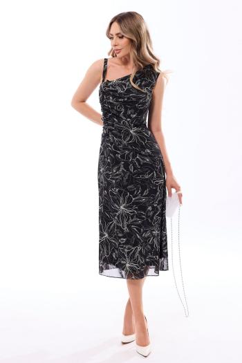Платье женское нарядно-повседневное полуприлегающего силуэта расширенное к низу. Выполнено из хлопка. .Вырез горловины фигурный, воротник на стойке с фигурным вырезом. Рукав спущенный из отделочной ткани по низу с воланом собранным на сборку. Платье отрезное по лиии талии. Юбка ассиметричная с застежкой доверху на обметанные петли и пуговицы на подкладке. По низу юбки притачной волан из основной ткани. Декором платья служит дизайн ткани, съемный пояс из основной ткани и отделочные пуговицы.