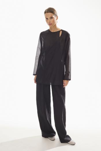 Свободный упрямленный силуэт, удобный покрой с заниженной линией плеча, строгие вертикальные рельефы подчеркнуты кантом и переходят в карман с листочкой. Спинка с центральным швом и шлицей. Рукав двухшовный. По линии плеч – функциональная застежка на декоративные пуговицы
