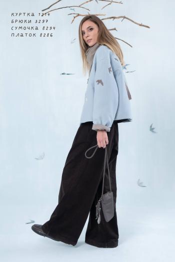 Прямой силуэт, втачной покрой, центральная застежка на петли и пуговицы, воротник-стойка. Полочка и спинка двойные от линии талии до 3/4 бедра. Полочка с отрезной кокеткой со сборкой и накладными карманами. Спинка с отрезной кокеткой и сборкой. Модель дополнена Контрастными пуговицами.