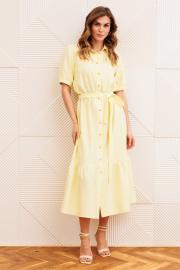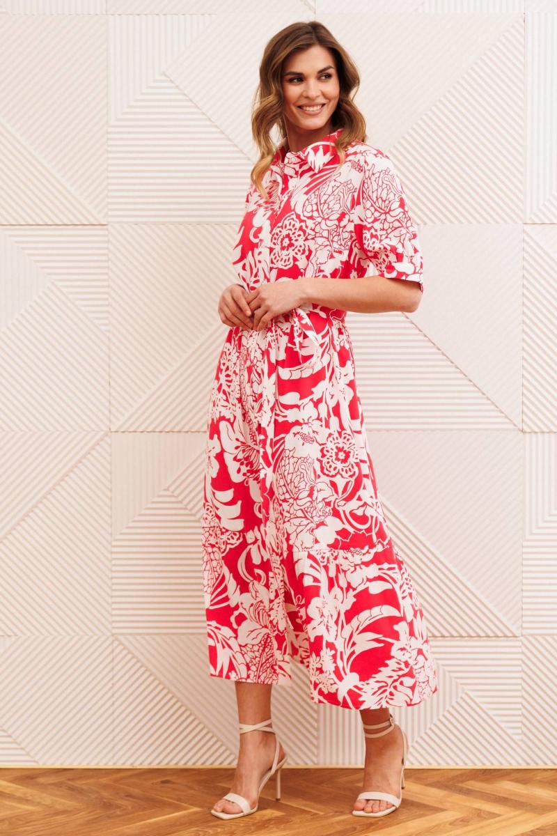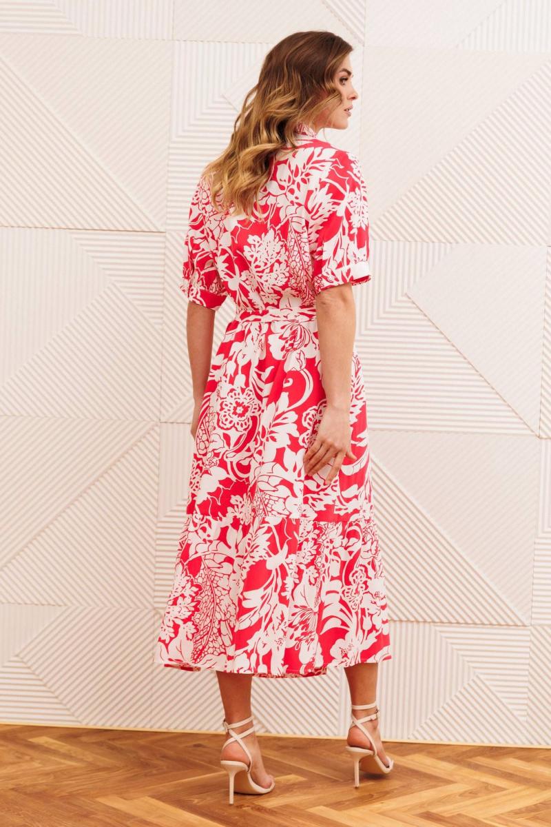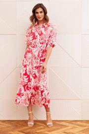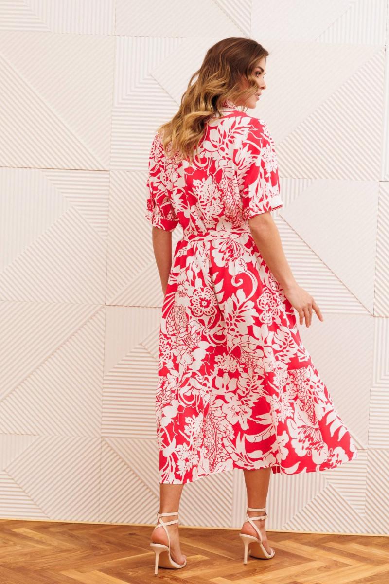 Платье А-образного силуэта выполнено из вискозной ткани с летним принтом. Платье с рубашечным воротником и центральной застежкой на петли и пуговиц. Перед с нагрудной вытачкой. Рукав втачной одношовный с притачной манжетой на петлю и пуговицу. По линии притачивания - сборка. По низу платья притачан волан со сборкой. К платью прилагается съемный пояс из основной ткани. Длина платья по спинке- 127 см, длина рукава- 29 см.