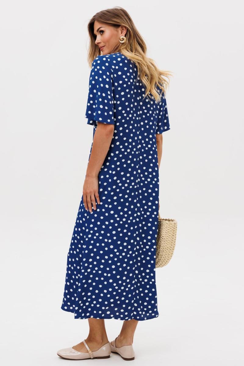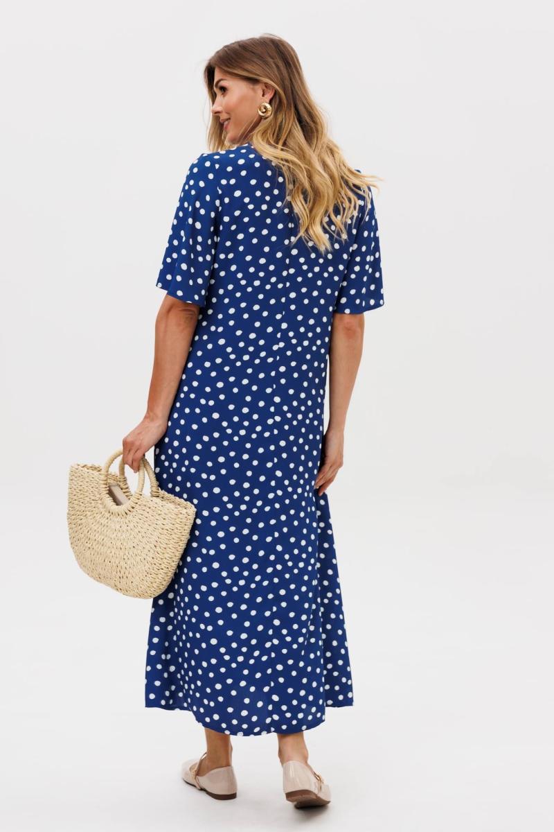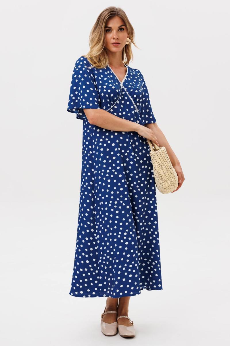 Платье А-образного силуэта выполнено из легкой вискозной ткани. Перед с V-образным вырезом и подрезами. В подрезах и вдоль горловины вставлено кружево. В районе груди в подрезах сборка. Рукав втачной расширенный книзу. Спинка со средним швом. Длина платья - 125 см, длина рукава - 30 см.
