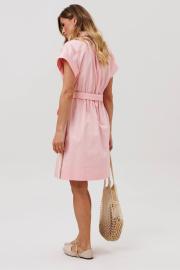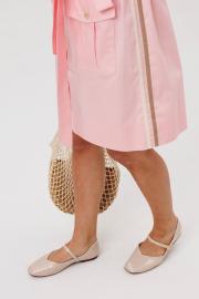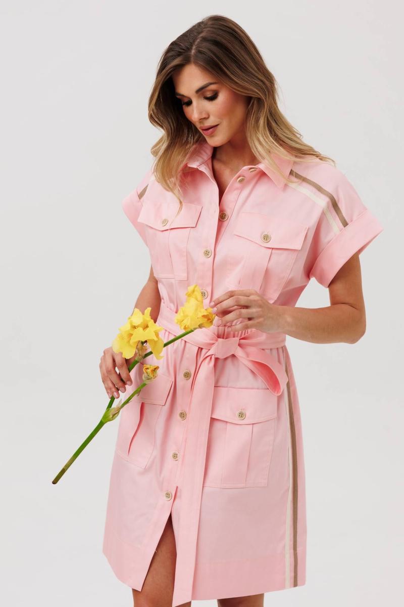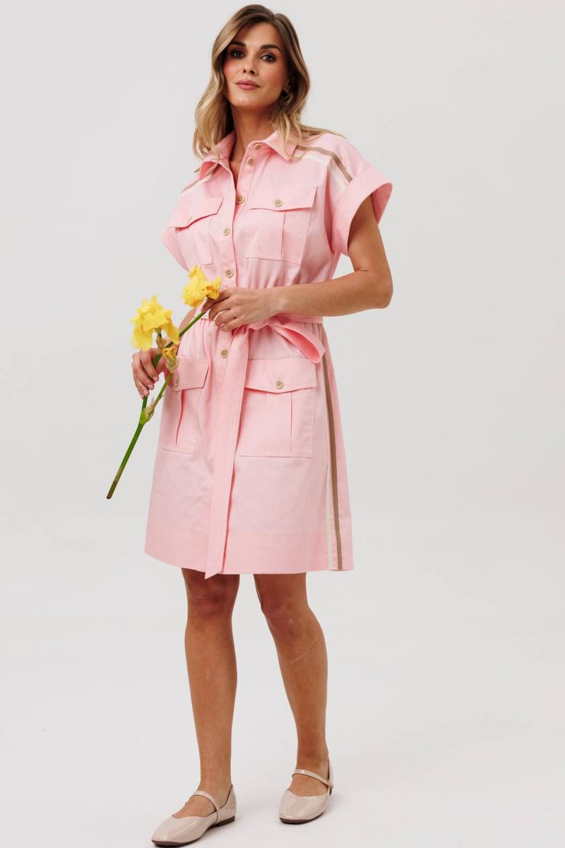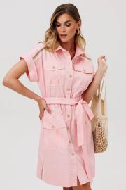 Платье в стиле сафари X-образного силуэта. Застежка центральная на петли и пуговицы с отрезной планкой. Рукав спущенное плечо с манжетой с отворотом по краю. Кокетка по переду переходящая на спинку. Спереди настрочены карманы со складкой и клапанами в районе груди и бёдер. По бокам и по краю кокетки сверху настрочена декоративная тесьма. К платью прилагается пояс из основной ткани. Длина платья - 95 см.