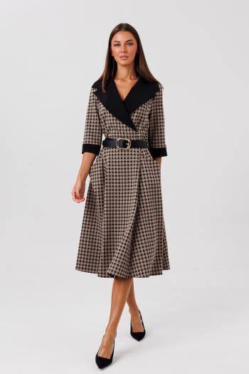 Платье прямого кроя из вельветовой ткани. Перед с застежкой "поло". Воротник на стойке. В районе бедер настрочные карманы, в районе груди настрочные клапаны. Рукав со спущенным плечом, втачной, со сборкой по окату и в месте притачивания манжеты. Манжета с застежкой на 2 петли и пуговицы. Фурнитура может быть изменена с сохранением художественного образа. Длина платья - 92 см, длина рукава платья - 51см.