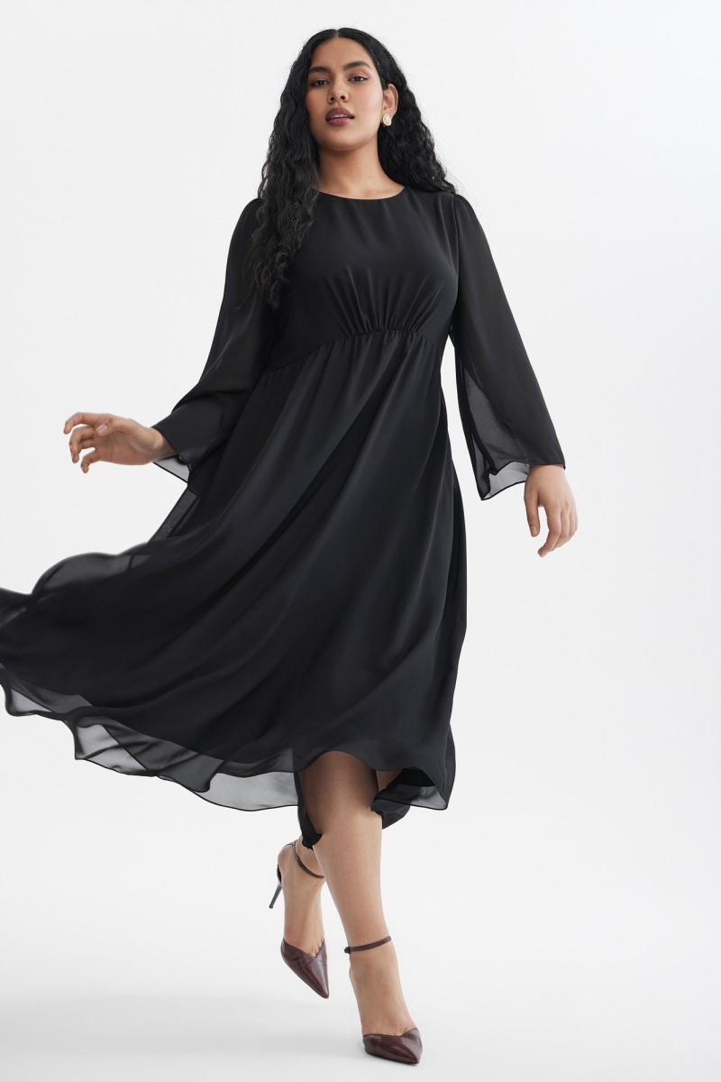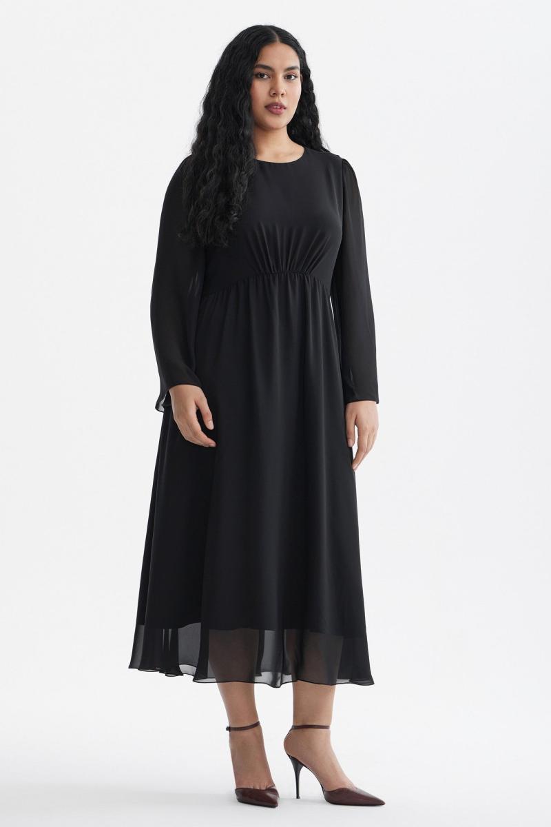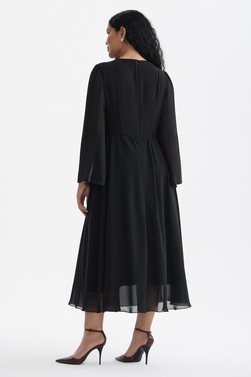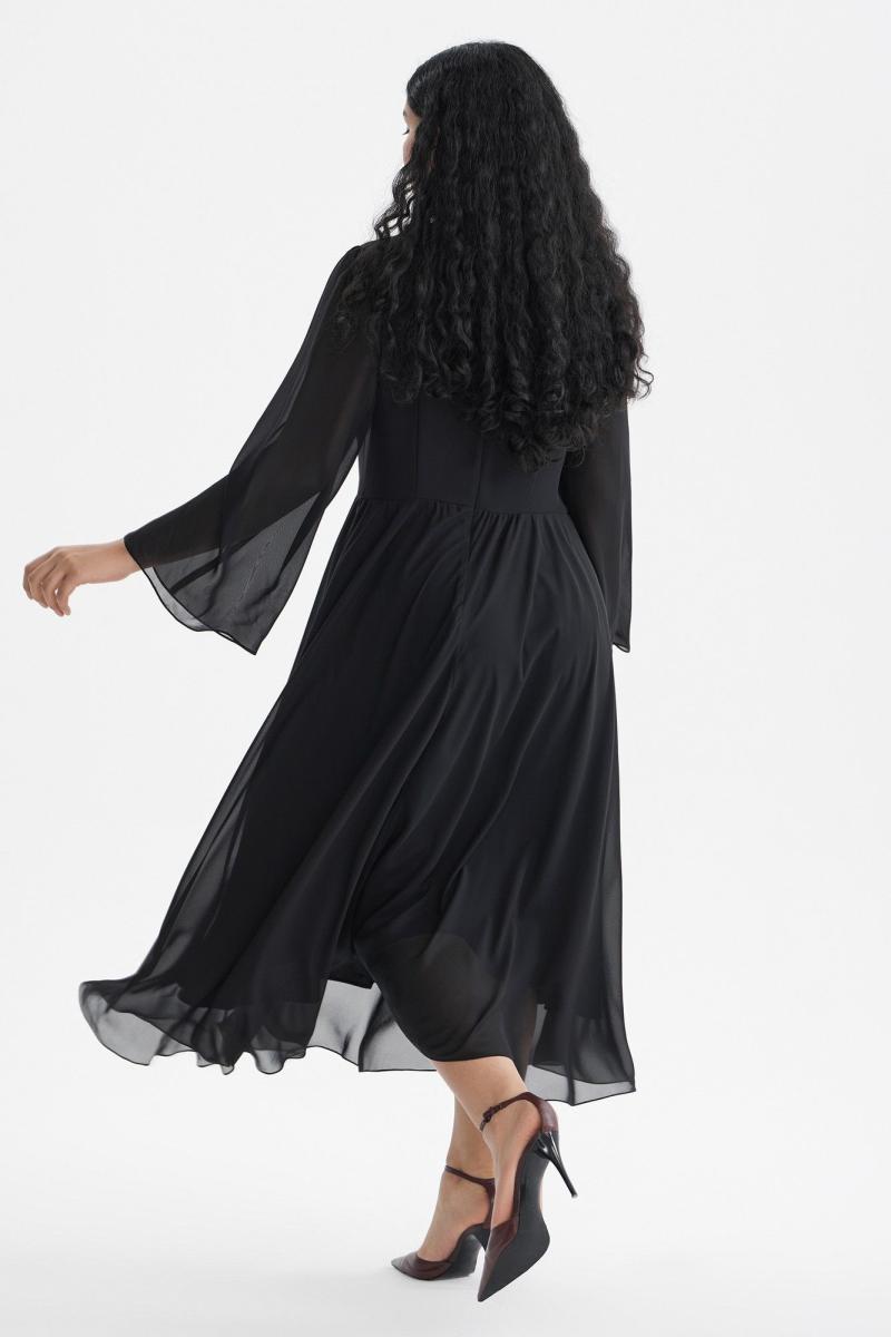 Платье отрезное по линии талии, без воротника, с круглым вырезом горловины, с застежкой на потайную молнию в среднем шве спинки. Шов по талии присборен. Верхняя часть переда частично присборена по талиевому шву. Спинка со средним швом. Нижняя часть платья с юбкой- солнце. Рукав втачной, длинный, расширенный к низу, со сборкой по окату. Платье на подкладке.