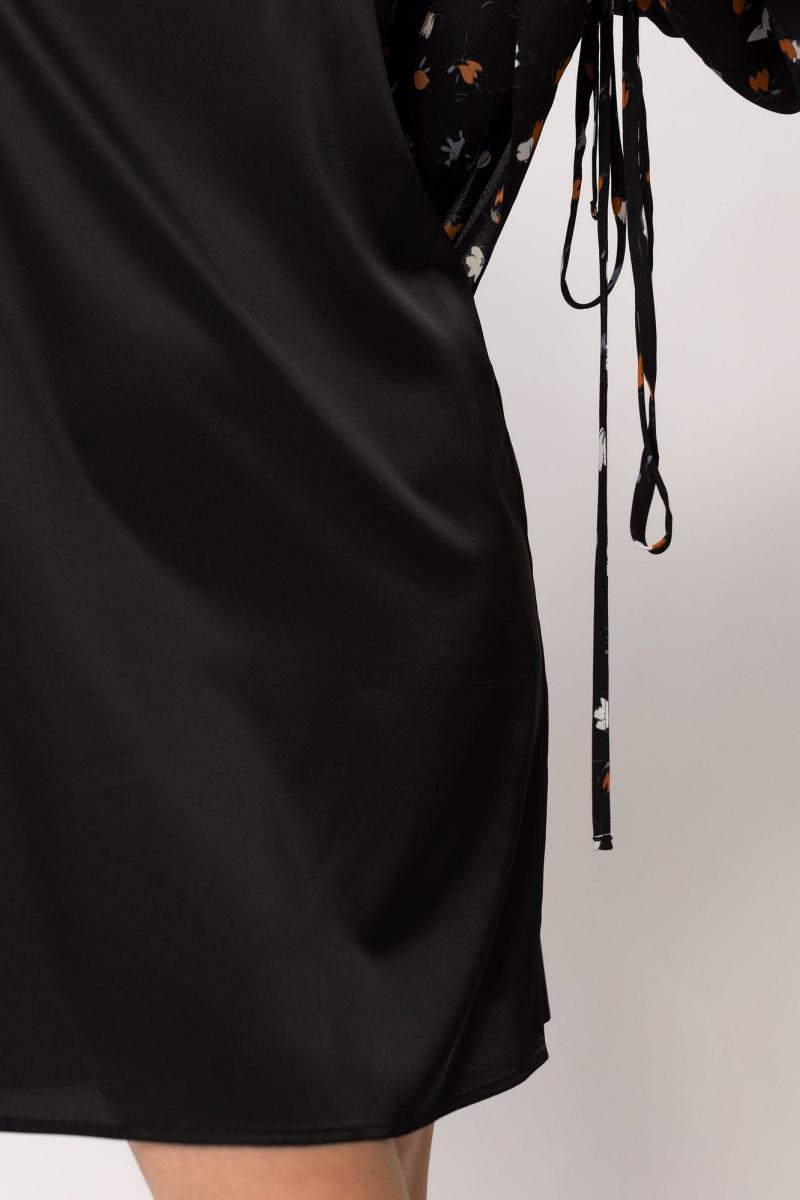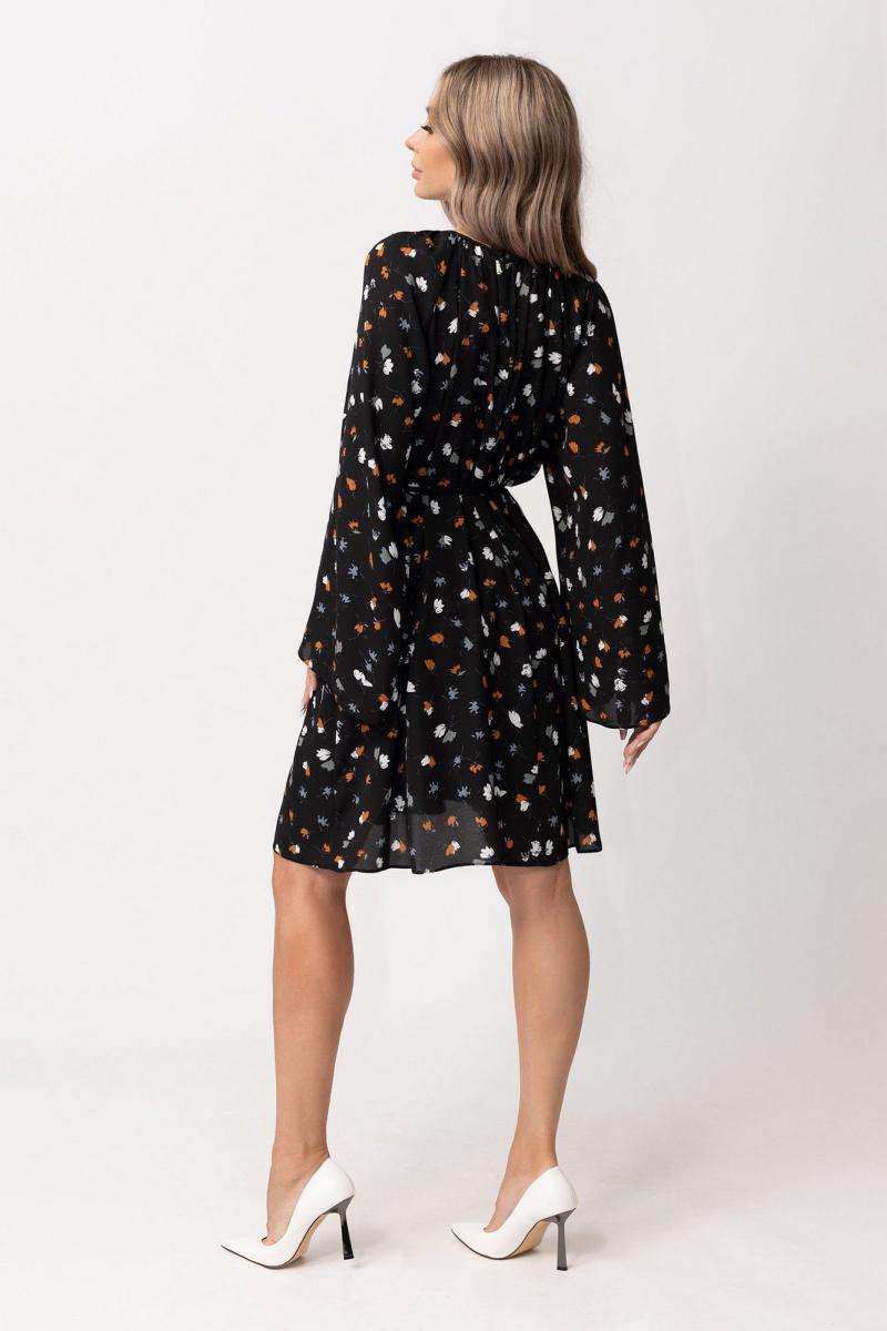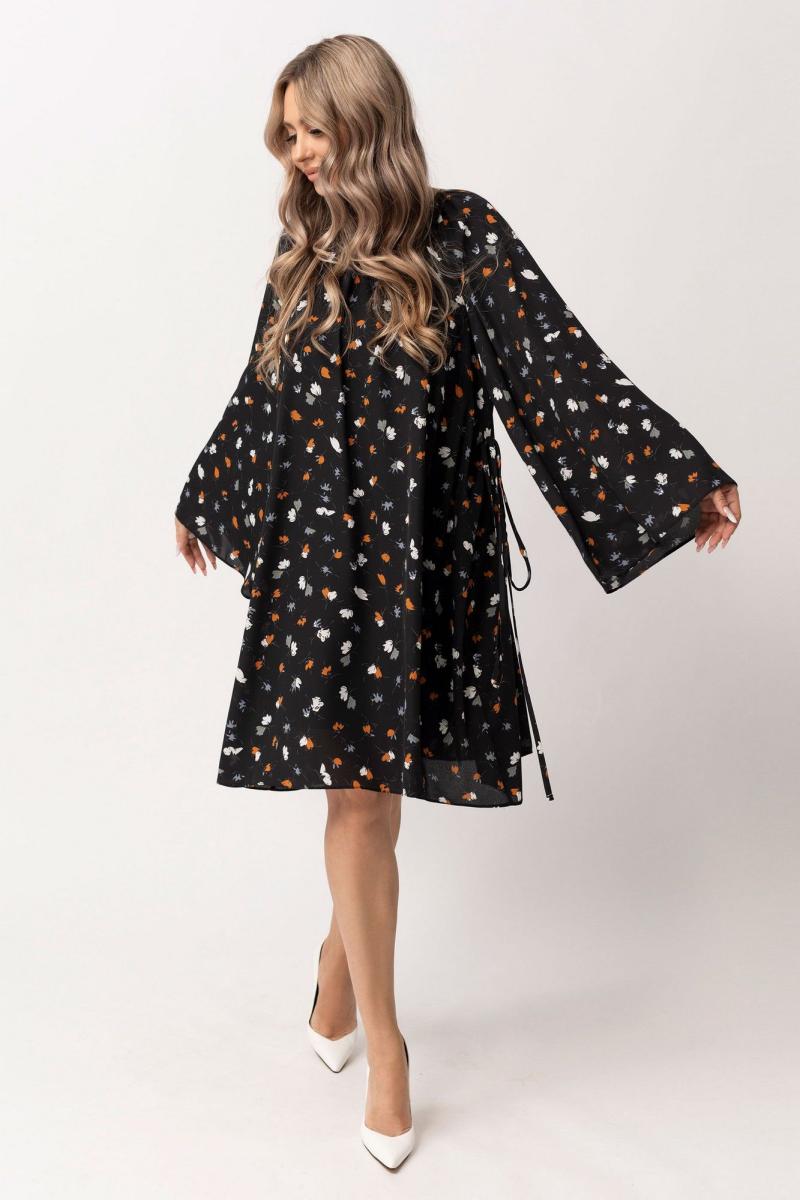 Платье состоит из двух изделий- верхнее и нижнее платье. Верхнее платье расширенного к низу силуэта с застежкой на навесную петлю и пуговицу по горловине спинки, без воротника, с круглым вырезом горловины. По горловине переда и спинки- сборка. Перед и спинка цельные. Рукав реглан, длинный, расширенный к низу. Платье со съемным поясом. Нижнее платье полуприлегающего силуэта, на бретелях. Комплект из верхнего и нижнего платьев.