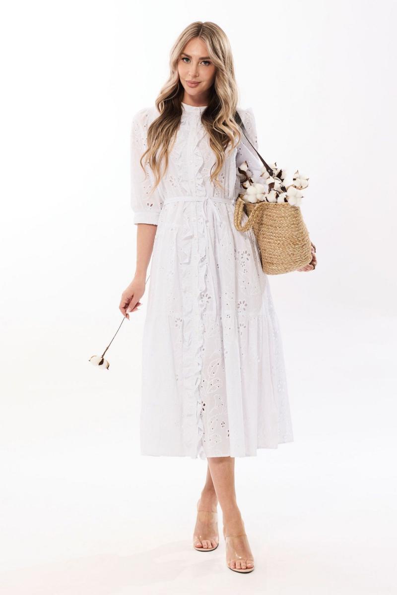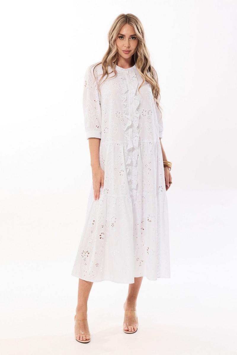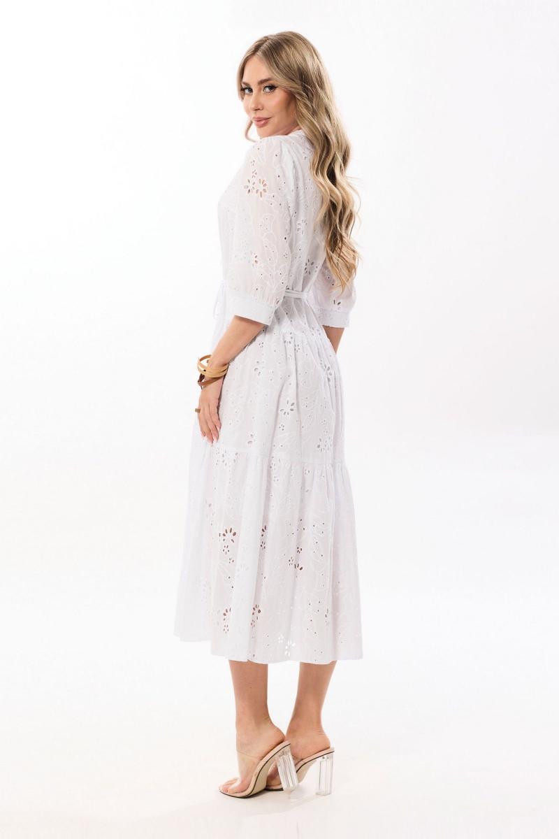 Платье с центральной застежкой на петли и пуговицы, отрезным воротиком- стойкой Застежка расположена на отрезной планке с втачными рюшами вдоль всей планки. Полочки и спинка с двумя рядами воланов по низу. Рукав втачной, 3/4, с отрезной манжетой. Окат и низ рукава со сборкой. Платье со съемным поясом- шнуром. Платье на подкладке.