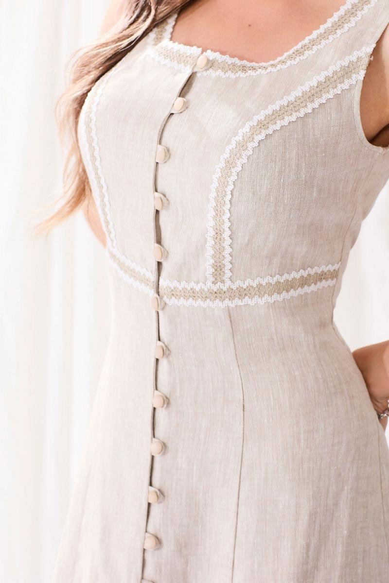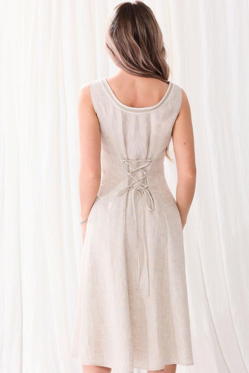 Платье, без воротника, без рукавов, с круглым вырезом горловины, центральной застежкой на навесные петли и пуговицы. По переду с рельефами, выходящими из проймы. Горловина переда и спинки, верхняя часть рельефов переда, талия переда декорирована кружевом в тон основной ткани. Спинка с рельефами, выходящими из проймы. По центральной части спинки на уровне талии навесные петли со шнуровкой.