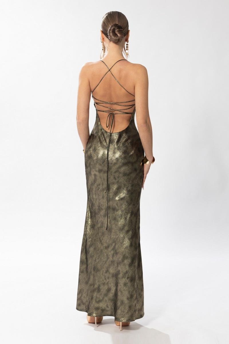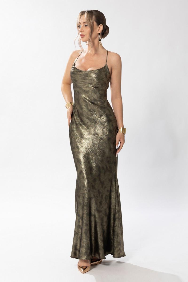Платье полуприлегающего силуэта, на бретелях, без застежки, без воротника, по горловине переда- драпировка- качель. Спинка с глубоким вырезом . Из боковых швов выходят навесные петли, в которые протянут шнур. Платье без подкладки.