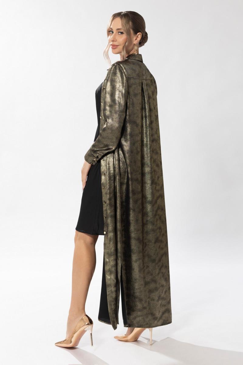 Платье с центральной застежкой на петли и пуговицы, втачным воротником с отрезной стойкой. По переду с клапанами. Спинка с отрезной кокеткой, переходящей на перед. Платье двойное. Нижнее платье на бретелях, с нагрудными вытачками по переду. Платье со съемным поясом. Платье из шифона с рисунком. Нижнее платье в одной цветовой гамме. Съемный пояс контрастен платью.