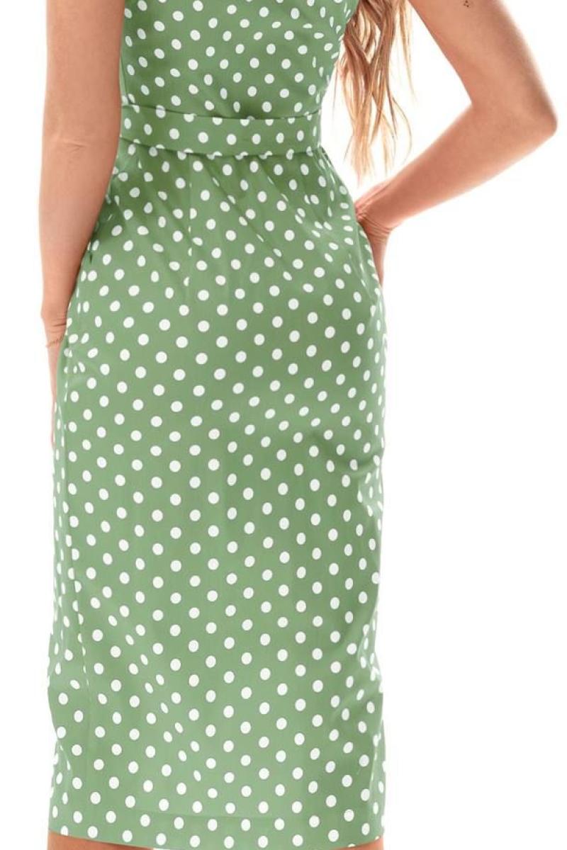 Платье с центральной застежкой на петли и пуговицы, на широких бретелях. Платье отрезное по линии талии. Верхняя часть переда с талиевыми вытачками, нижняя часть переда с карманами и односторонними складками по талии. Нижняя деталь спинки с талиевыми вытачками. Платье со съемным поясом.