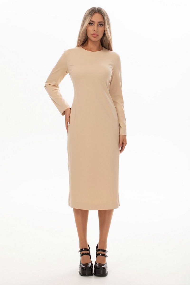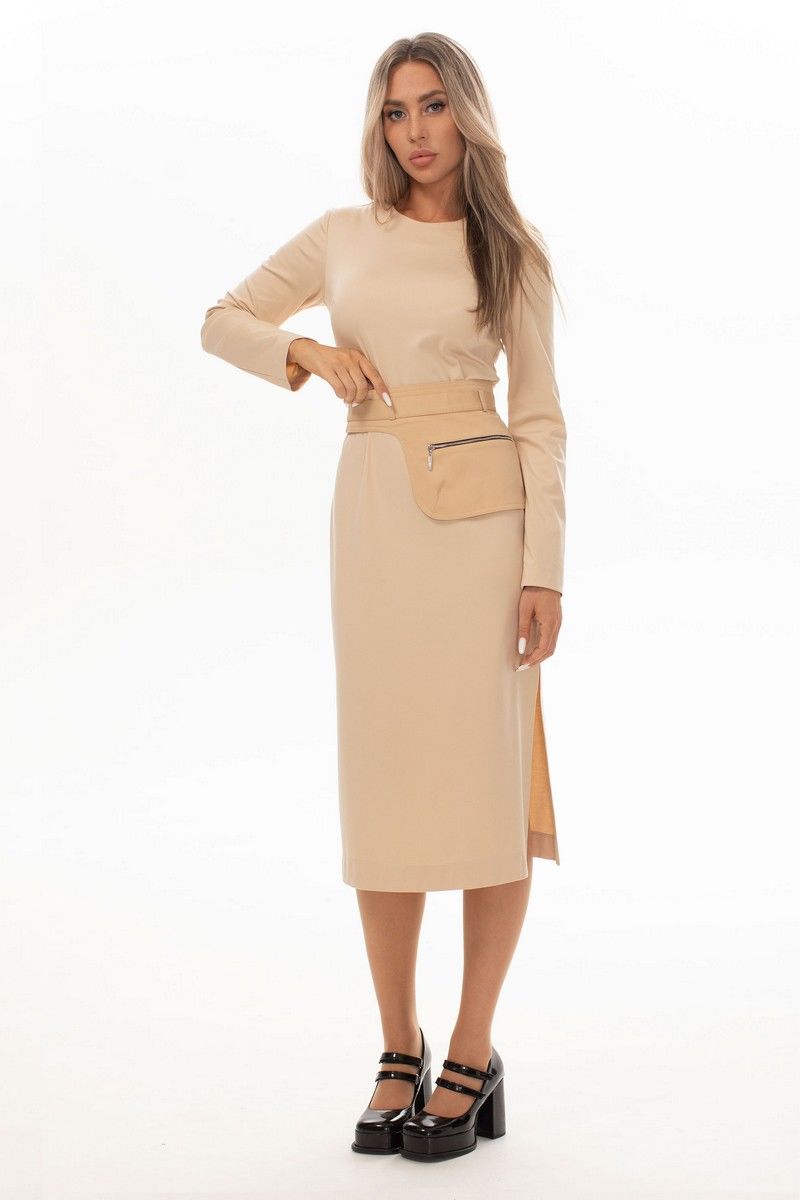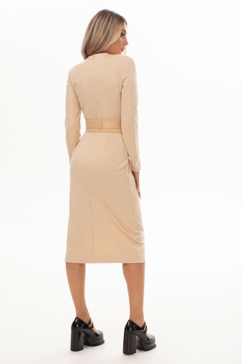 Платье, без воротника, с круглым вырезом горловины, застежкой на потайную молнию в среднем шве спинки. По переду с нагрудными вытачками. Спинка со средним швом, талиевыми вытачками. Правый боковой шов с разрезом. Рукав втачной, длинный. Платье со съемным поясом-сумкой. Без подкладки.