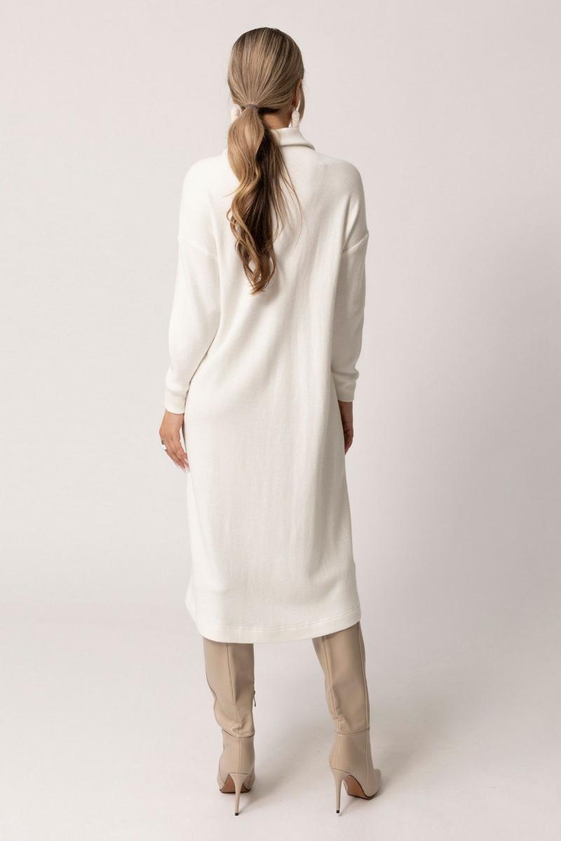 Платье прямого силуэта с отложным воротником, центральной застежкой на петли и пуговицы. Спинка цельная. Плечо спущенное. Рукав втачной, длинный, с отрезной манжетой.