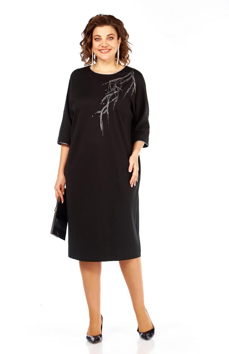 Платье женское нарядное, изготовлено из трикотажного полотна. Горловина круглой формы с кантом. На полочке дизайнерская вышивка. Спинка со средним швом и декоративной застежкой вверху. Рукава спущенные с кантом по низу.