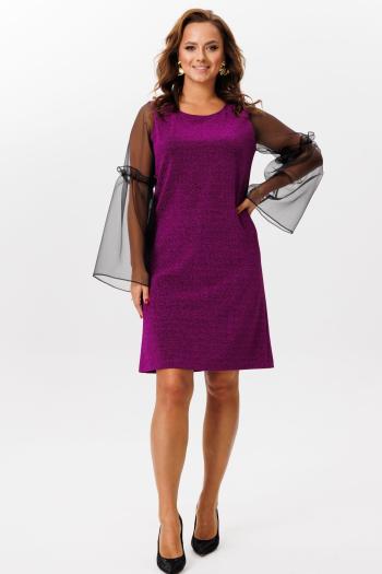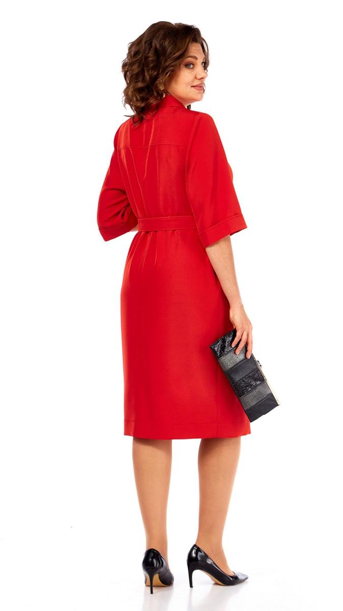 Платье женское прямого силуэта, выполнено из костюмно-плательной ткани. Вырез V-образной формы с отложным воротником. По переду обработан ассиметричный рельеф со шлицей по низу и декоративный клапан на груди. Спинка с кокеткой и средним швом. Рукава втачные, по низу отложные манжеты. Платье дополнено съемным поясом из основной ткани с полукольцами и декоративными пуговицами. Длина платья по спинке — 107 см, длина рукава — 38 см. р.52 — ПОГ 57 см ПОБ 59 см, р.54 — ПОГ 59 см ПОБ 61 см, р.56 — ПОГ 61 см ПОБ 63 см.