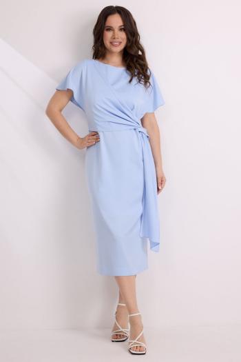 Платье женское, А-силуэта выполнено из натуральной ткани. По переду застежка на петли и пуговицы. Платье отрезное по линии талии, с декоративным поясом, частично присобранным на эластичную тесьму. Нижняя часть юбки с имитацией запаха, с левой стороны обработан карман с планкой. Спинка со встречной складкой. Рукава втачные, короткие, с отложной манжетой. Платье дополнено печатью.