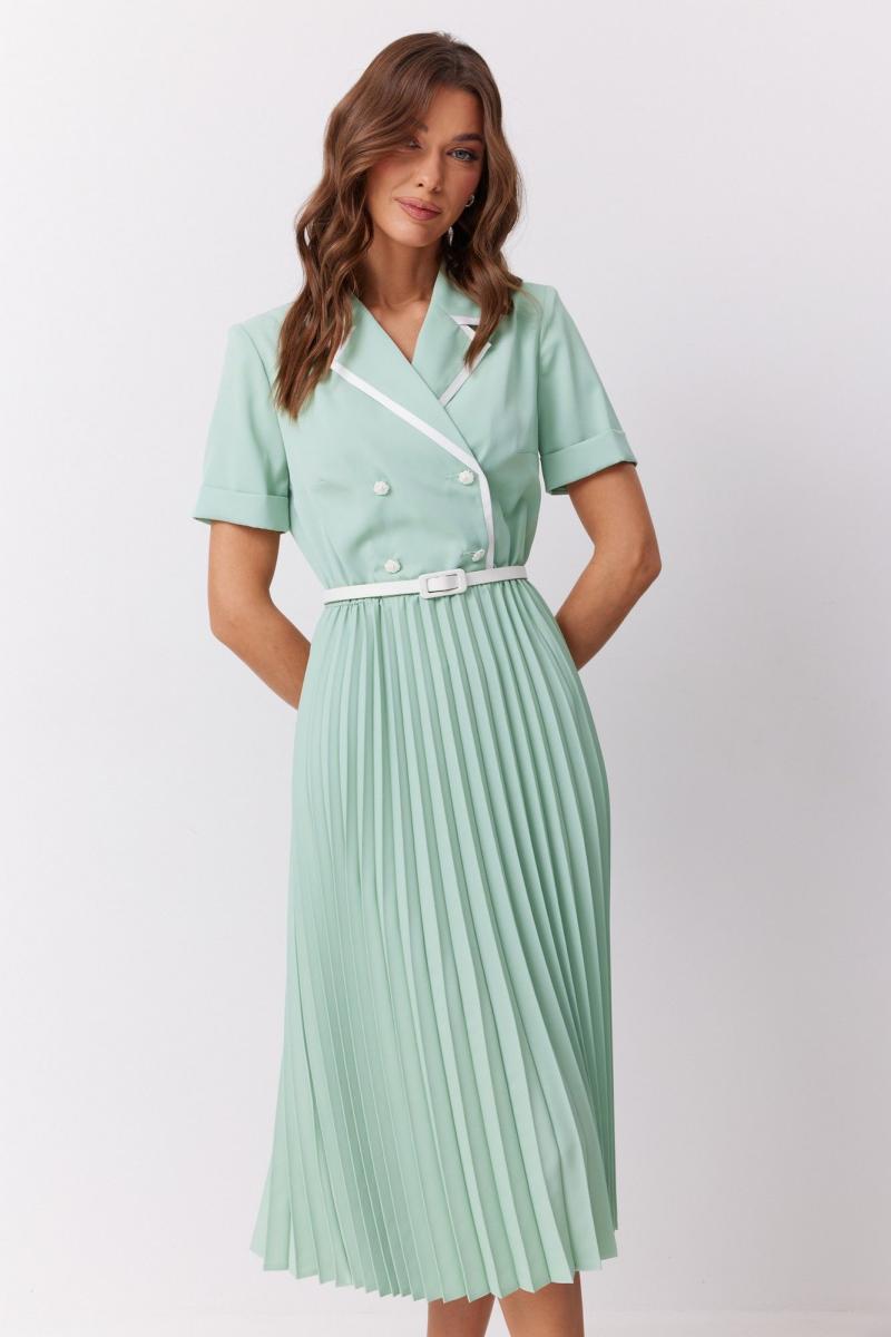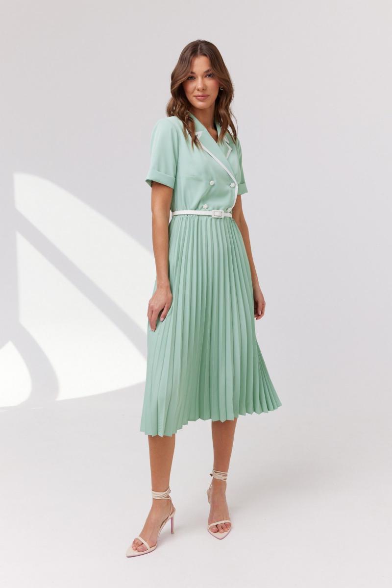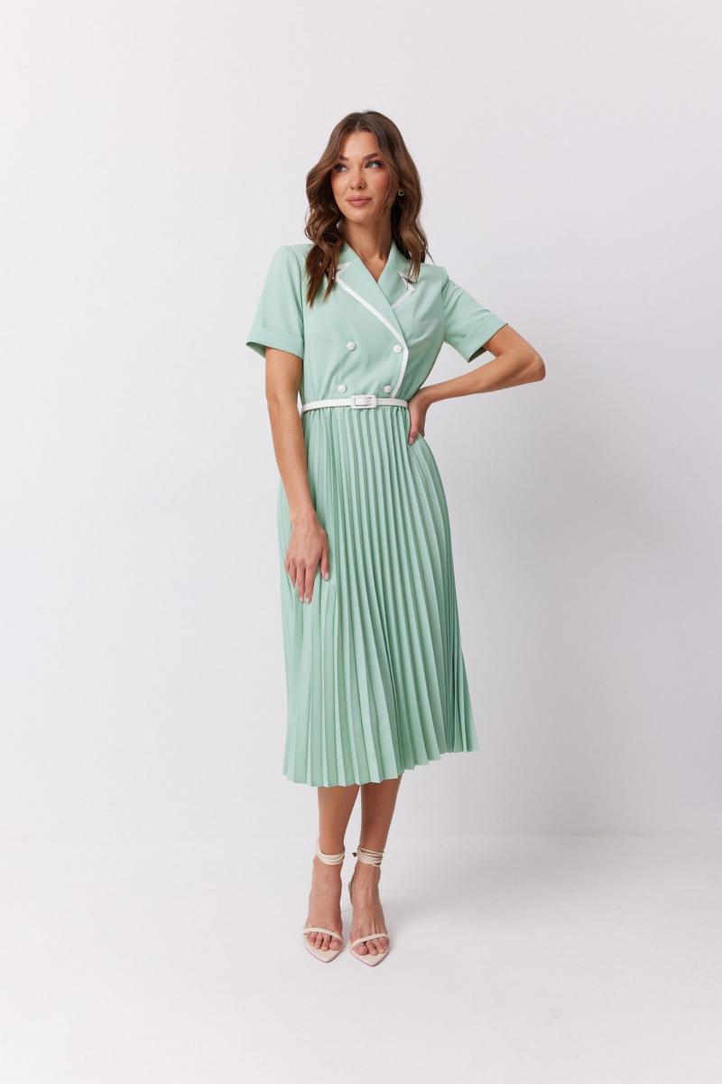 Платье женское полуприлегающего силуэта, отрезное по линии талии. Лиф переда с нагрудными вытачками и двубортной застежкой на декоративные петли и пуговицы. Спинка лифа со средним швом. По горловине воротник с отрезной стойкой. Край воротника и борта обработан планками из ткани-компаньона. Рукав короткий, одношовный, с отворотом по низу. Юбка платья А-образной формы из гофрированного полотна. Декоративные элементы и фурнитура могут отличаться от заявленных на фото. Цвет материала может отличаться по тону в зависимости от настроек вашего монитора!