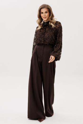 Силуэтное платье с разрезами на плечах и декоративными патами на рукавах. По переду два рельефа, проходящих через центр груди. По низу рельефа справа шлица с регулируемой длиной разреза за счёт застёжки на пуговицы. Платье застёгивается на потайную молнию на спинке. Комплектуется текстильным ремнём. Длина платья - 128 см.
