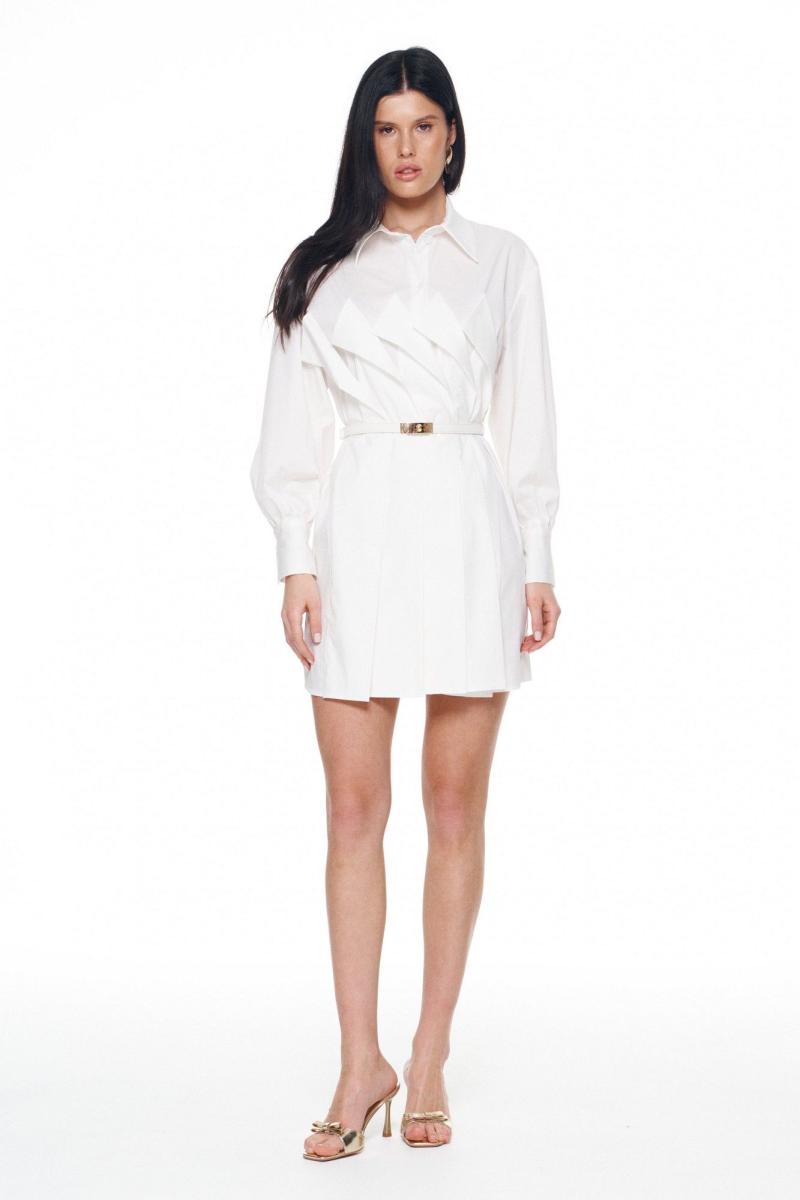 Приталенное мини-платье на запах с трапецевидным низом выполнено из плотной поливискозной ткани на подкладке. Линия плеча слегка спущена, горловина с небольшой стойкой. Застежка фронтальная, двубортная на пуговицы. Длина изделия по среднему шву 42-46р - 84см.