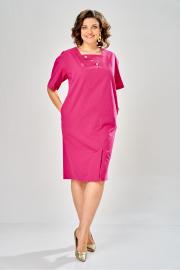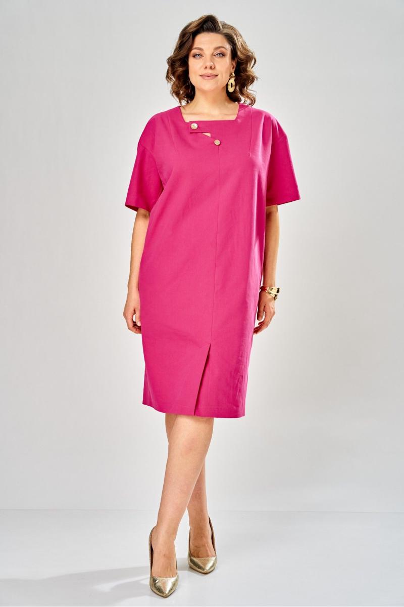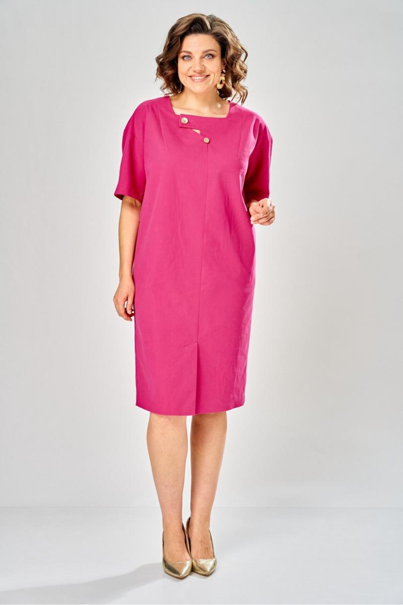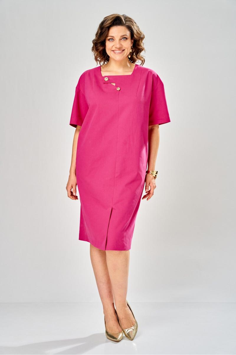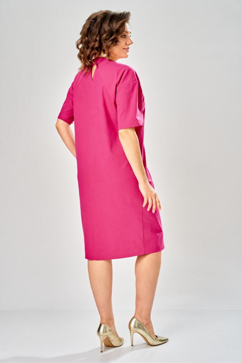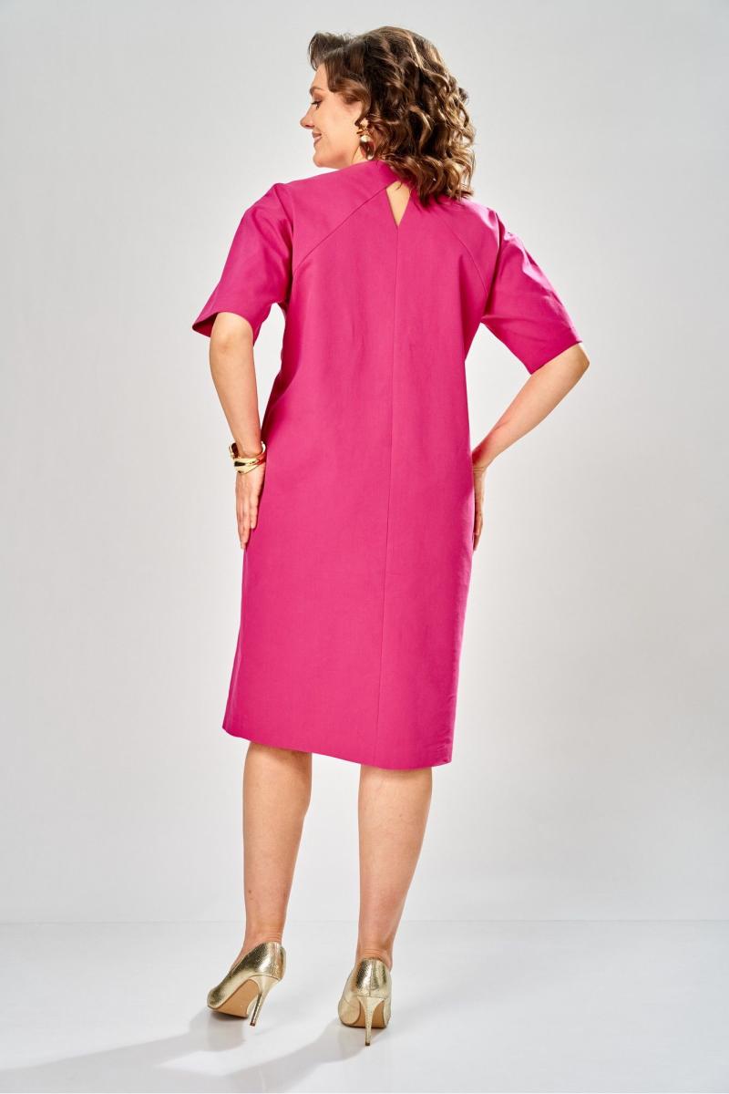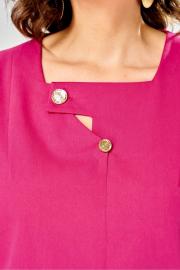 Платье В-образного силуэта, с фигурным вырезом по переду, со смещённым центром по переду со шлицей. Спущена линия плеча, с в точным рукавом. По переду две декоративные пуговицы. Спинка разрезная, низ платья обработан открытым срезом, на машине потайного стежка. Длина платья по среднему шву 105 см Длина рукова от горловины 42 см