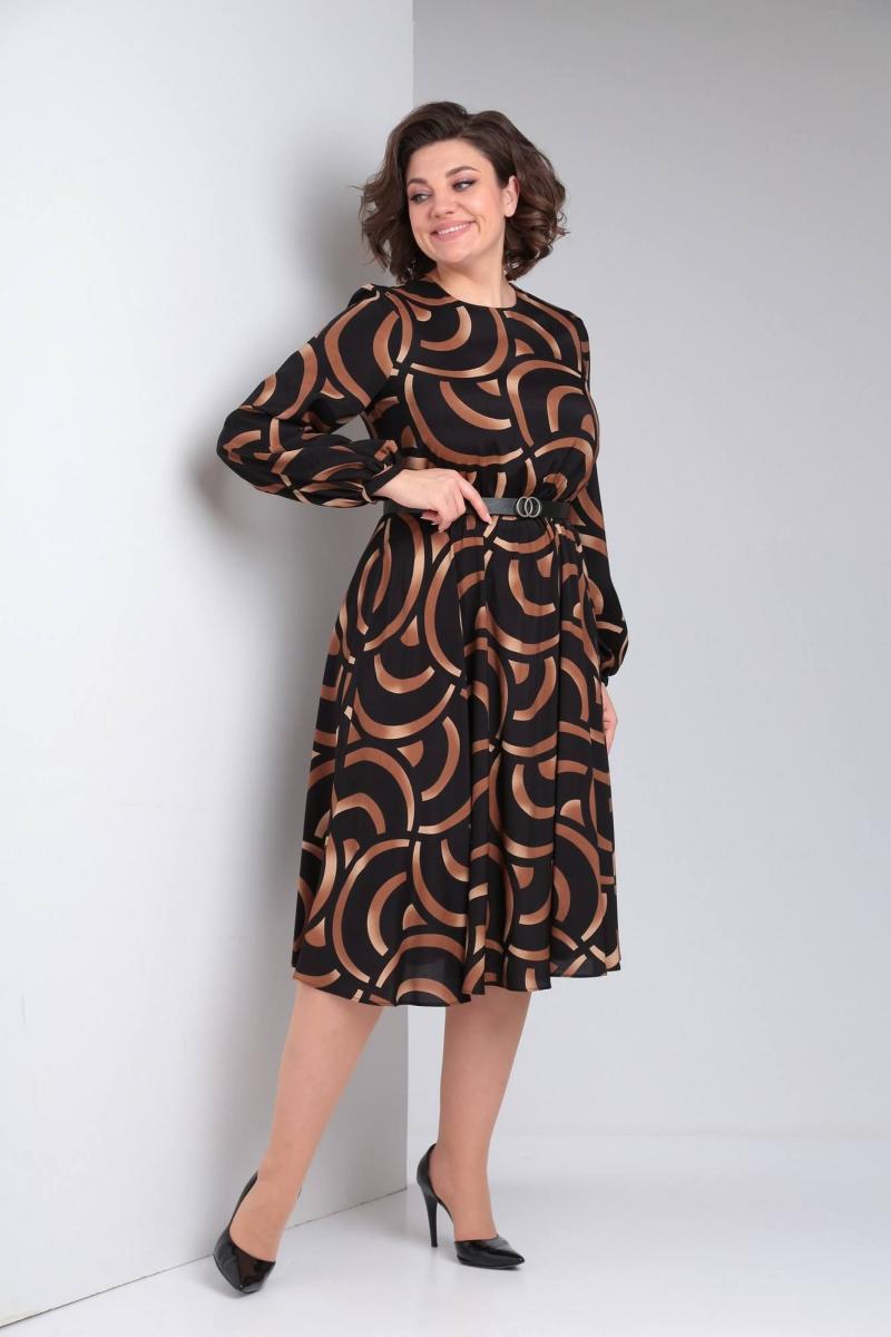 Платье женское свободного силуэта, выполнено из текстильной ткани с принтом. Платье отрезное по линии талии, расширенное к низу. Отрез по талии пересобран на резинку. Головина округлая. Рукав длинный, в тачной, одно шовный. По окату рукава заложены односторонние складки, низ рукава на притачной манжете. Спинка платья без среднего шва, вверху по горловине вырез - капелька, застегивающийся на пуговицу. Лиф платья на подкладке, юбка без подкладки. Пояс в комплект не входит.