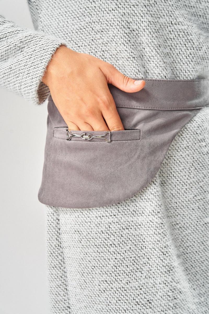 Вырез горловины округлой формы с втачной бейкой. Перед и спинка цельные. Рукава втачные одношовные длинные, линия плеча спущена. В левом боковом шве обработан разрез. В комплекте съемный пояс с застежкой на пряжку. На съемном поясе обработан карман с листочкой с втачными концами.