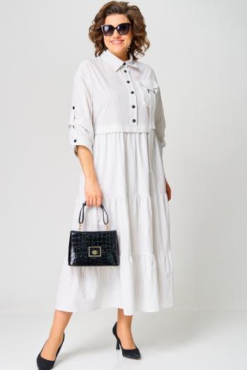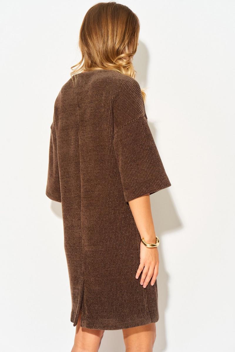 Вырез горловины округлой формы. Перед платья цельный, с нагрудными вытачками. Спинка со средним швом, который заканчивается шлицей. Рукава втачные одношовные длиной 3/4. Линия плеча спущена.